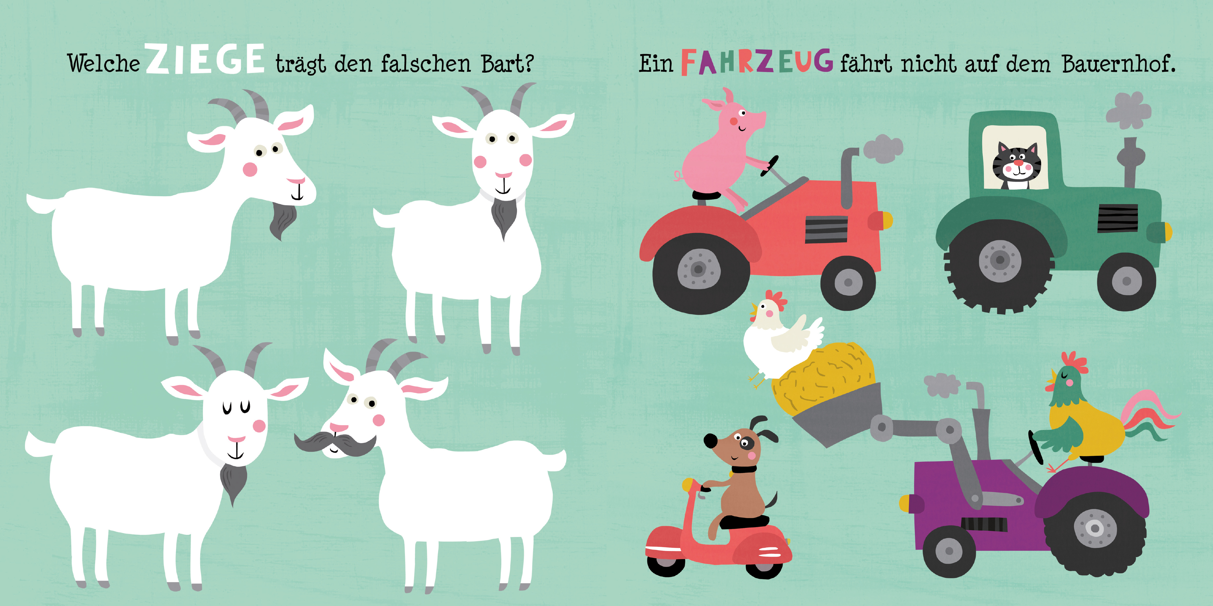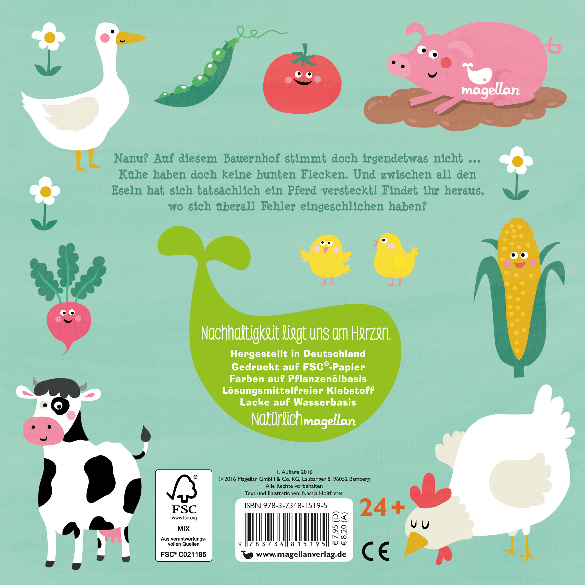 Nanu? Auf diesem Bauernhof stimmt doch irgendetwas nicht ... Kühe haben doch keine bunten Flecken. Und zwischen all den Eseln hat sich tatsächlich ein Pferd versteckt! Findet ihr heraus, wo sich überall Fehler eingeschlichen haben?