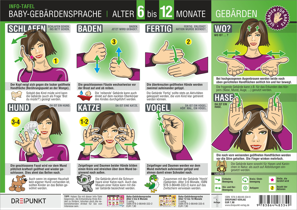 Noch kann unser Kind nicht sprechen. Aber wir haben die Möglichkeit, mit Hilfe von Gebärden mit ihm zu kommunizieren. Besitzen Sie noch keine Baby-Gebärdentafel, empfehlen wir, mit der Info-Tafel 'Baby-Gebärdensprache von 3 bis 6 Monaten' zu beginnen, um die Grundlagen zu erlernen (auch wenn Ihr Kind bereits älter als 3 Monate ist).
