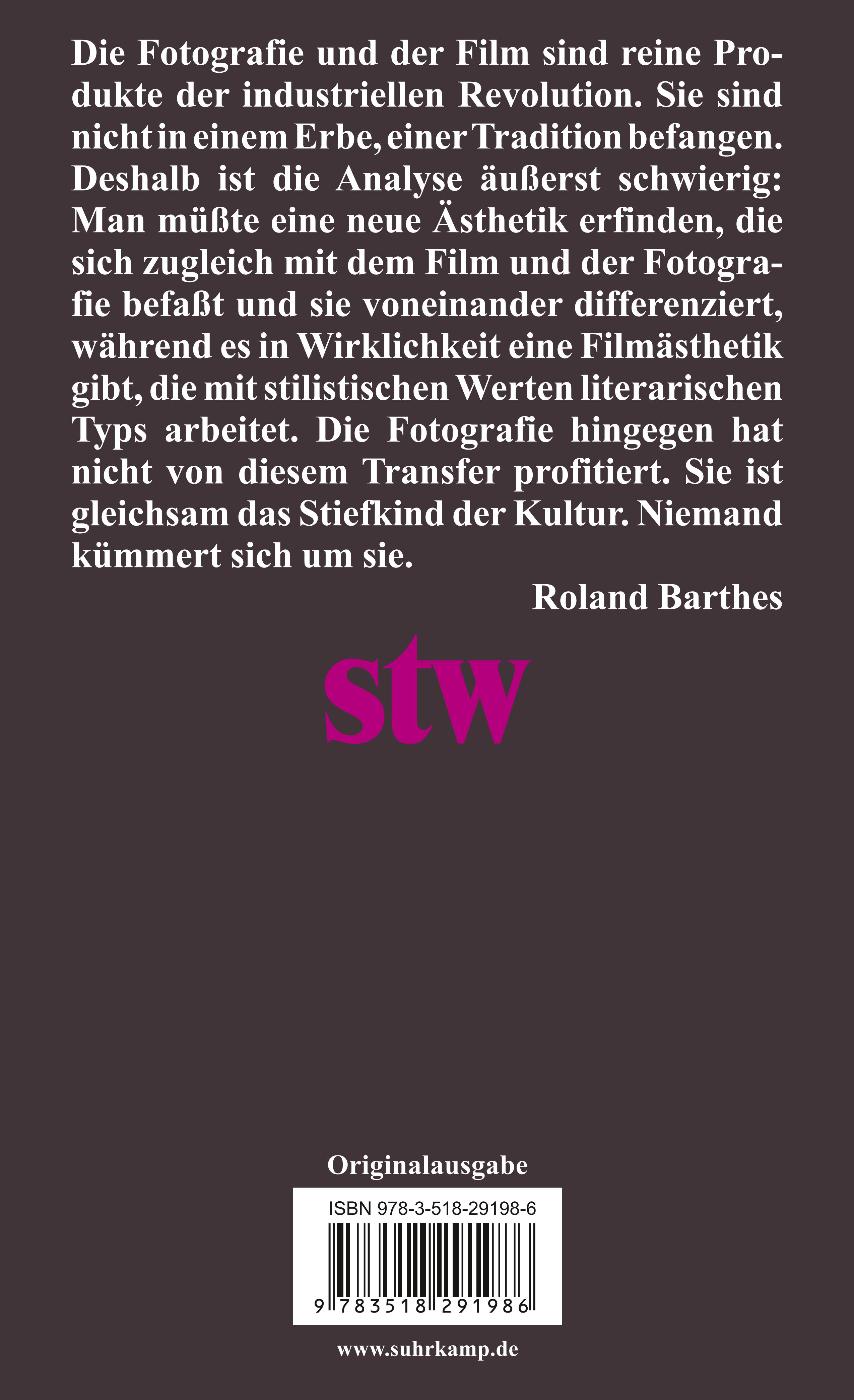 "Die Fotografie und der Film sind reine Produkte der industriellen Revolution. Sie sind nicht ein einem Erbe, einer Tradition befangen. Deshalb ist die Analyse außerstg schwierig: Man müsste eine neue Ästhetik erfinden, die sich zugleich mit dem Film und der Fotografie befasst und sie voneinander differenziert, während es in Wirklichkeit eine Filmästhetik gibt, die mit stilistischen Werten literarischen Typs arbeitet. Die Fotografie hingegen hat nicht von diesem Transfer profitiert. Sie ist gleichsam das Stiefkind der Kultur. Niemand kümmert sich um sie." (Roland Barthes)