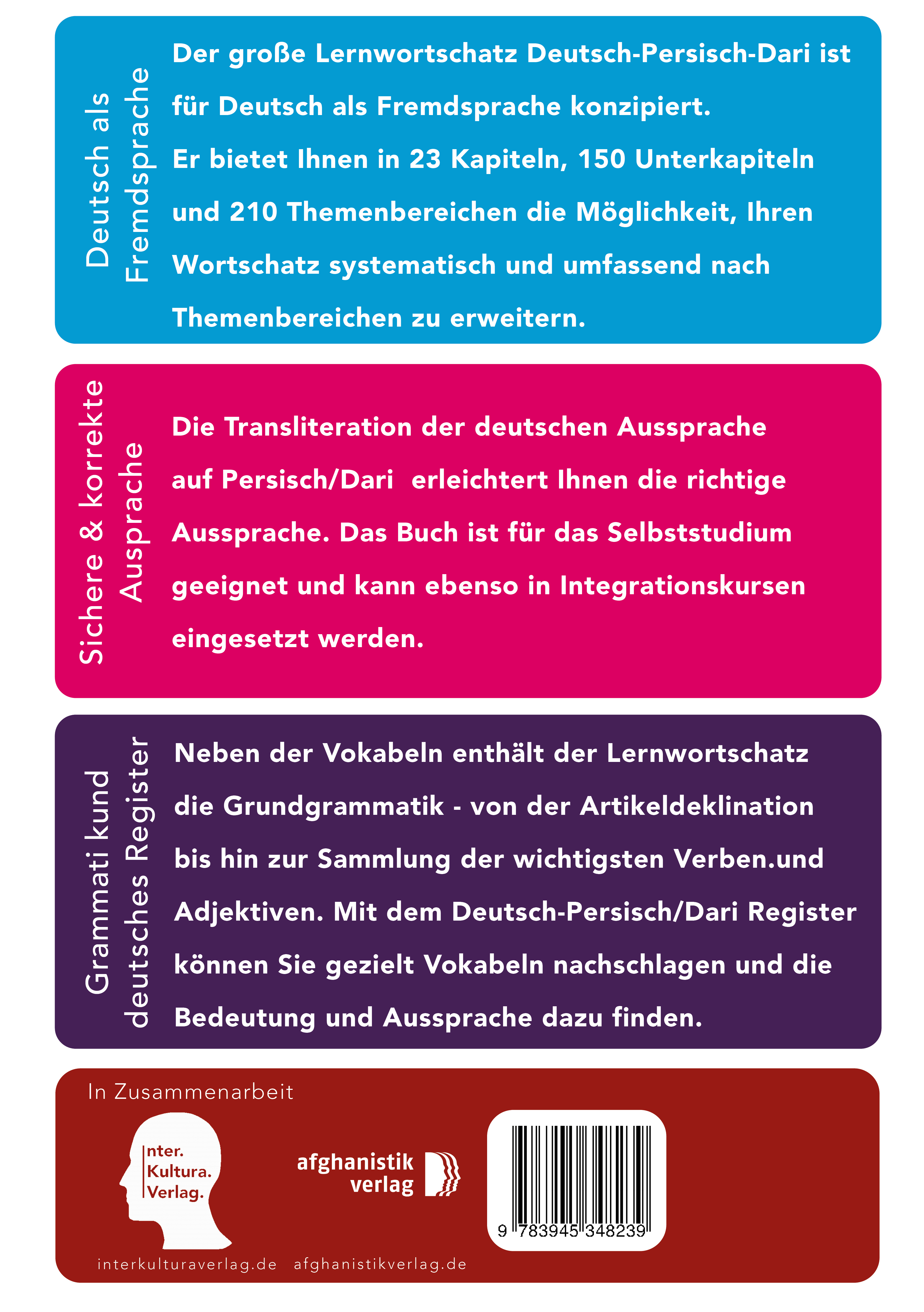 | Zusatzinfo | Deutsch-Persisch / Dari Großer Lernwortschatz für Deutsch als Fremdsprache » 4000 Wörter zu über 220 Themen » Kompakt, systematisch und übersichtlich » Dari Transkription der deutschen Vokabeln » Mit Kurzgrammatik für die Grundstufe A1-B1 » Mit Register auf Deutsch und Persisch-Dari |
