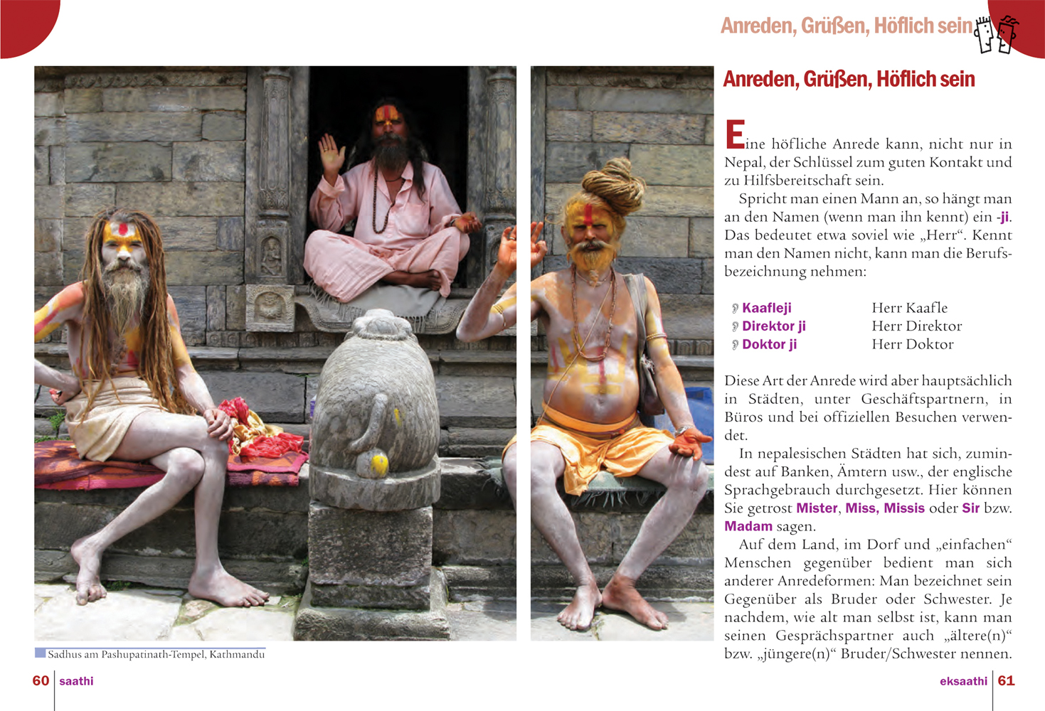 Das Nepali der einfachen Menschen ist leicht zu erlernen und reicht zur Verständigung völlig aus, zudem fällt Deutschsprachigen die Aussprache aufgrund der Ähnlichkeit relativ leicht. Aber fährt man nach Nepal mit dem Ziel, Land und Leute kennenlernen zu wollen, ist die Sprache genauso wichtig wie die Verhaltensweisen und Regeln, durch deren Einhaltung man der fremden Kultur den nötigen Respekt zollt. Dass Kühe in Nepal heilig sind, mag noch allgemein bekannt sein, aber dass einem alle Sünden des Tages vergeben werden, wenn man den nepalesischen König erblickt, dass man Geld erhalten wird, wenn die linke Handfläche juckt und es unhöflich ist, beim Sitzen seinem Gegenüber die Fußflächen zu zeigen, das alles erfährt man in diesem Kauderwelsch-Buch, das sich eben nicht nur mit der nepalesischen Sprache beschäftigt.
