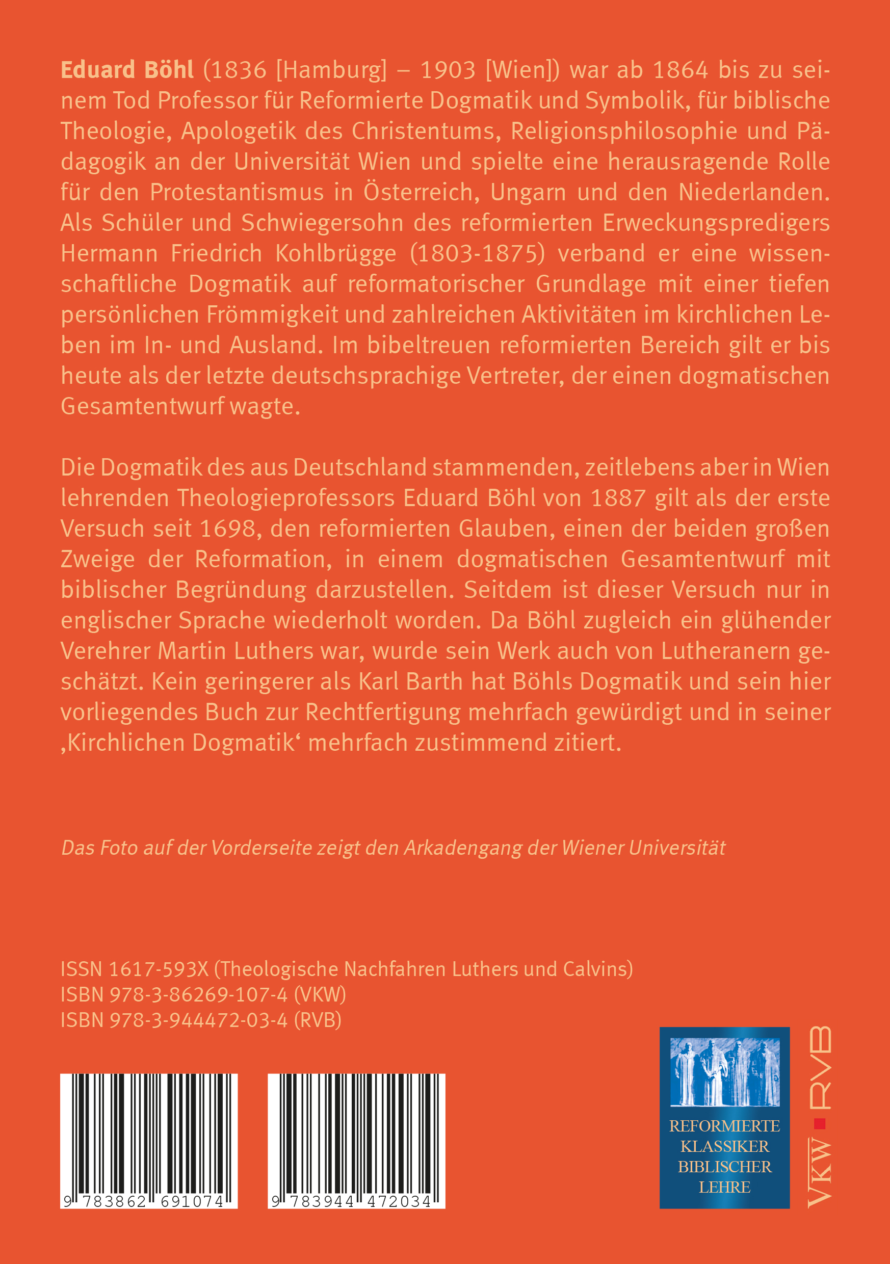 Eduard Böhl (1836 [Hamburg] – 1903 [Wien]) war ab 1864 bis zu seinem Tod Professor für Reformierte Dogmatik und Symbolik, für biblische Theologie, Apologetik des Christentums, Religionsphilosophie und Pä-dagogik an der Universität Wien und spielte eine herausragende Rolle für den Protestantismus in Österreich, Ungarn und den Niederlanden. Als Schüler und Schwiegersohn des reformierten Erweckungspredigers Hermann Friedrich Kohlbrügge (1803-1875) verband er eine wissenschaftliche Dogmatik auf reformatorischer Grundlage mit einer tiefen persönlichen Frömmigkeit und zahlreichen Aktivitäten im kirchlichen Leben im In- und Ausland. Im bibeltreuen reformierten Bereich gilt er bis heute als der letzte deutschsprachige Vertreter, der einen dogmatischen Gesamtentwurf wagte.