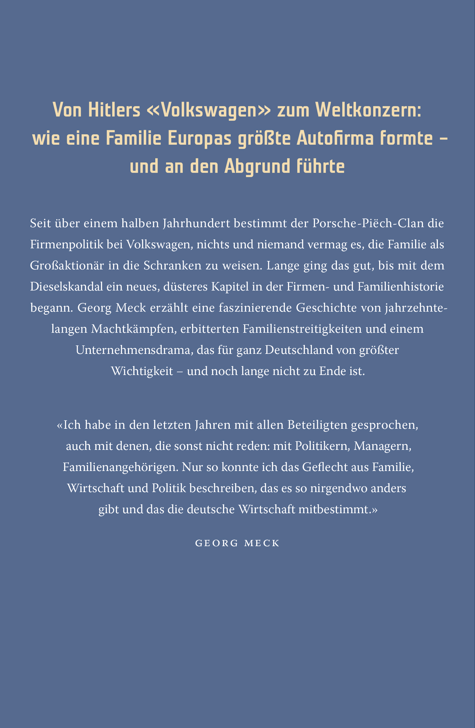 Drei Dinge zählen im Leben, behauptet Ferdinand Piëch, Enkel des genialen Ferdinand Porsche: "Volkswagen, Familie, Geld - in dieser Reihenfolge." Trickreich, ruppig und mit aller Härte hat die Familie Porsche Piëch den scheinbar unaufhaltsamen Aufstieg von Volkswagen vorangetrieben, seitdem Ferdinand Porsche im Auftrag Adolf Hitlers den "Volkswagen" konstruierte. Aber Anfang September 2015 erschütterte der folgenschwerste Industrieskandal der deutschen Geschichte den Konzern. Das war, so schreibt Georg Meck, kein unglücklicher Zufall: Der tiefe Sturz von VW hat viel mit der Geschichte des Konzerns zu tun - und mit der Familie.