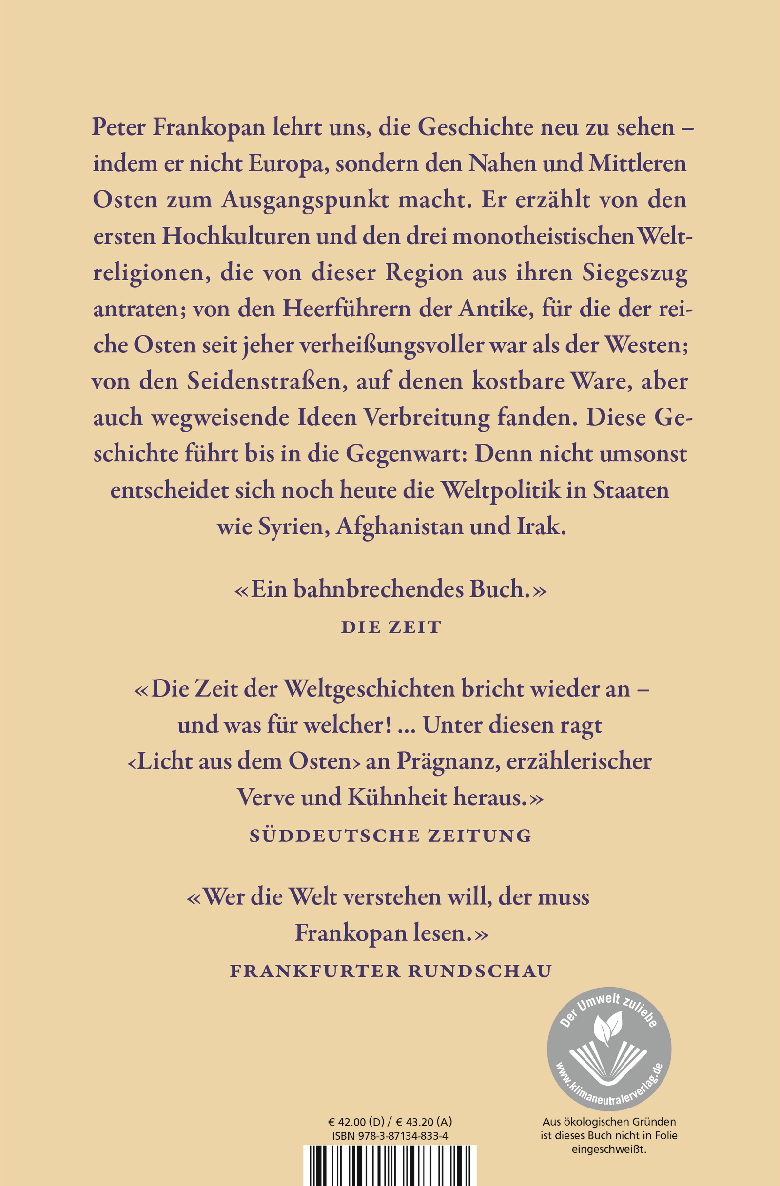 Ein bahnbrechendes Buch ... Peter Frankopan ist ein begnadeter Regisseur seines Stoffes. Der Leser fühlt sich alsbald wie in einem Vergangenheitskino im Breitwandformat ... Das Faszinierende an diesem Buch sind neben dem enormen Kenntnisreichtum seine suggestive Synthesefähigkeit und seine erzählerische Kraft.