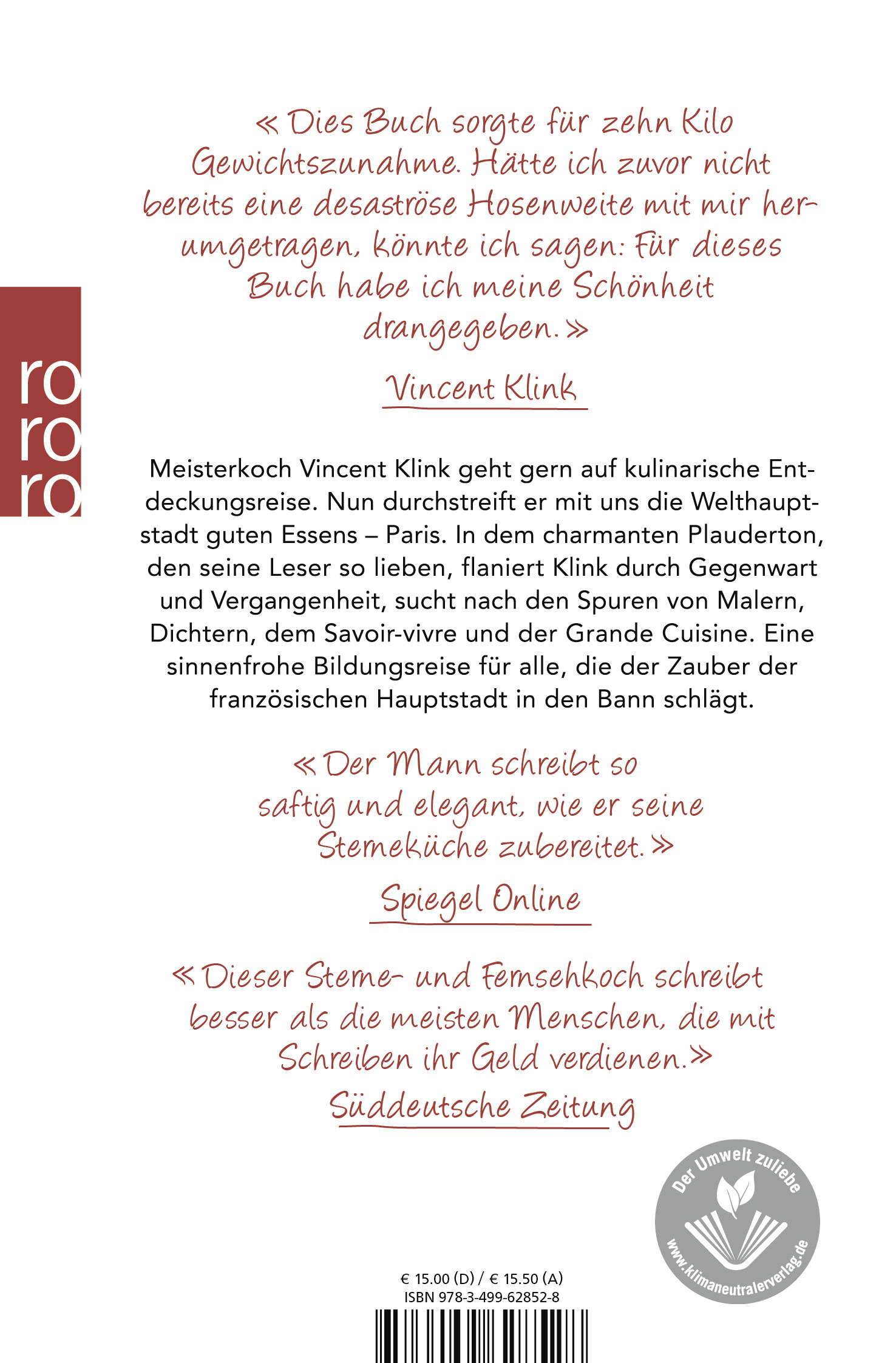 Meisterkoch Vincent Klink geht gern auf kulinarische Entdeckungsreise. Nun durchstreift er mit uns die Welthauptstadt guten Essens - Paris. In dem charmanten Plauderton, den seine Leser so lieben, flaniert Klink durch Gegenwart und Vergangenheit, sucht nach den Spuren von Malern, Dichtern, dem Savoir-Vivre und der Grande Cuisine. Eine sinnenfrohe Bildungsreise für alle, die der Zauber der französischen Hauptstadt in den Bann schlägt.