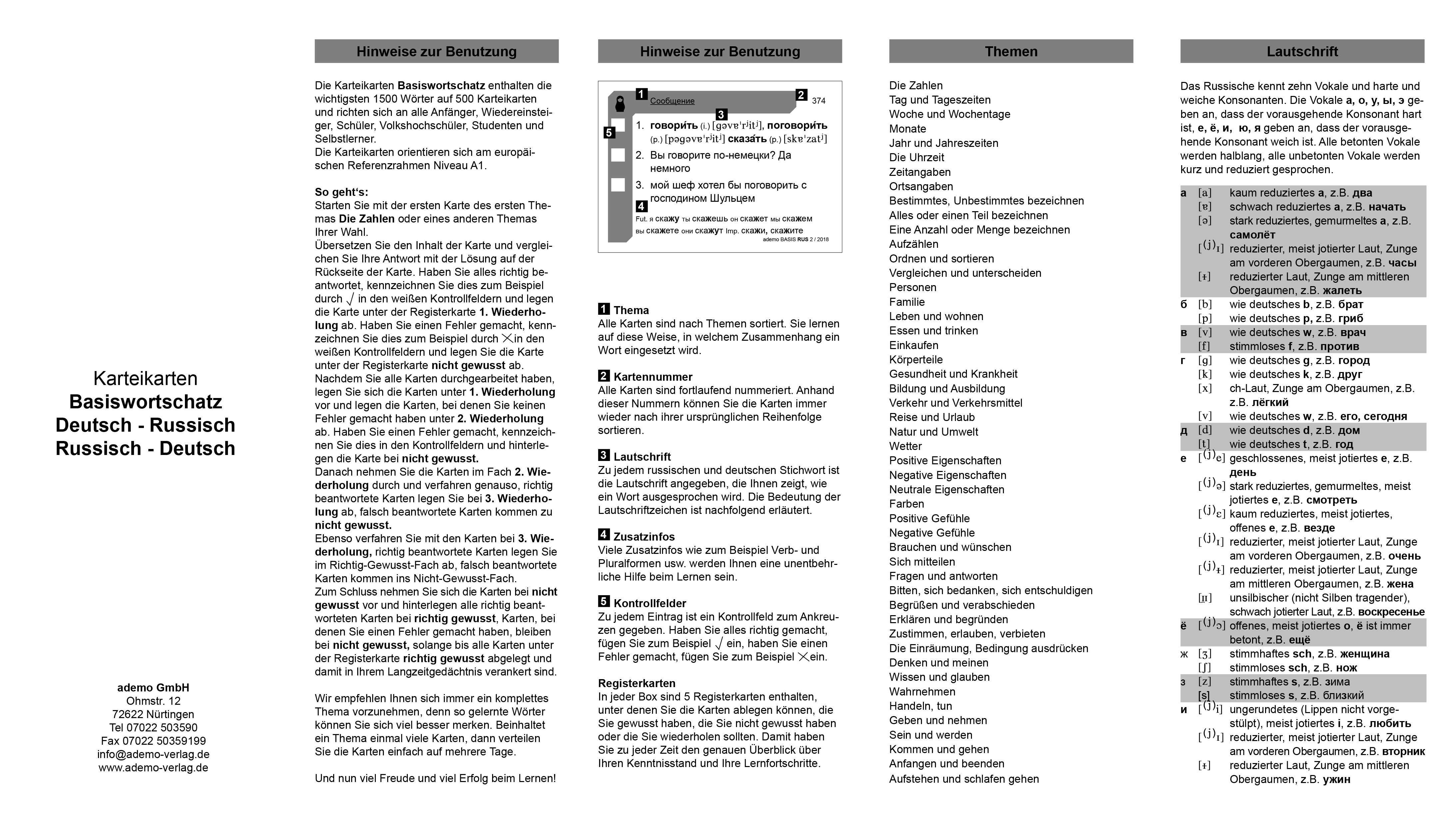 Die Karteikarten Basiswortschatz Russisch sind lehrbuchunabhängig und enthalten über 1500 Wörter und Beispielsätze auf 500 Karteikarten.Alle Wörter sind nach Themen geordnet. Auf diese Weise lernt man, in welchem Zusammenhang ein Wort eingesetzt wird. Wichtige Zusatzinformationen (z.B. Verbformen, Pluralformen usw.) in beiden Sprachen sind eine große Hilfe beim Lernen.Die Lautschrift zu jedem deutschen und russischen Stichwort (bilingual) zeigt die richtige Aussprache. Die zweisprachige Bedienungsanleitung erläutert die optimale Benutzung der Karteikarten.Kontrollfelder auf jeder Karte und Registerkarten in jeder Box sorgen für die Selbstkontrolle.Die Karteikarten Basiswortschatz Russisch orientieren sich am europäischen Referenzrahmen Niveau A1.