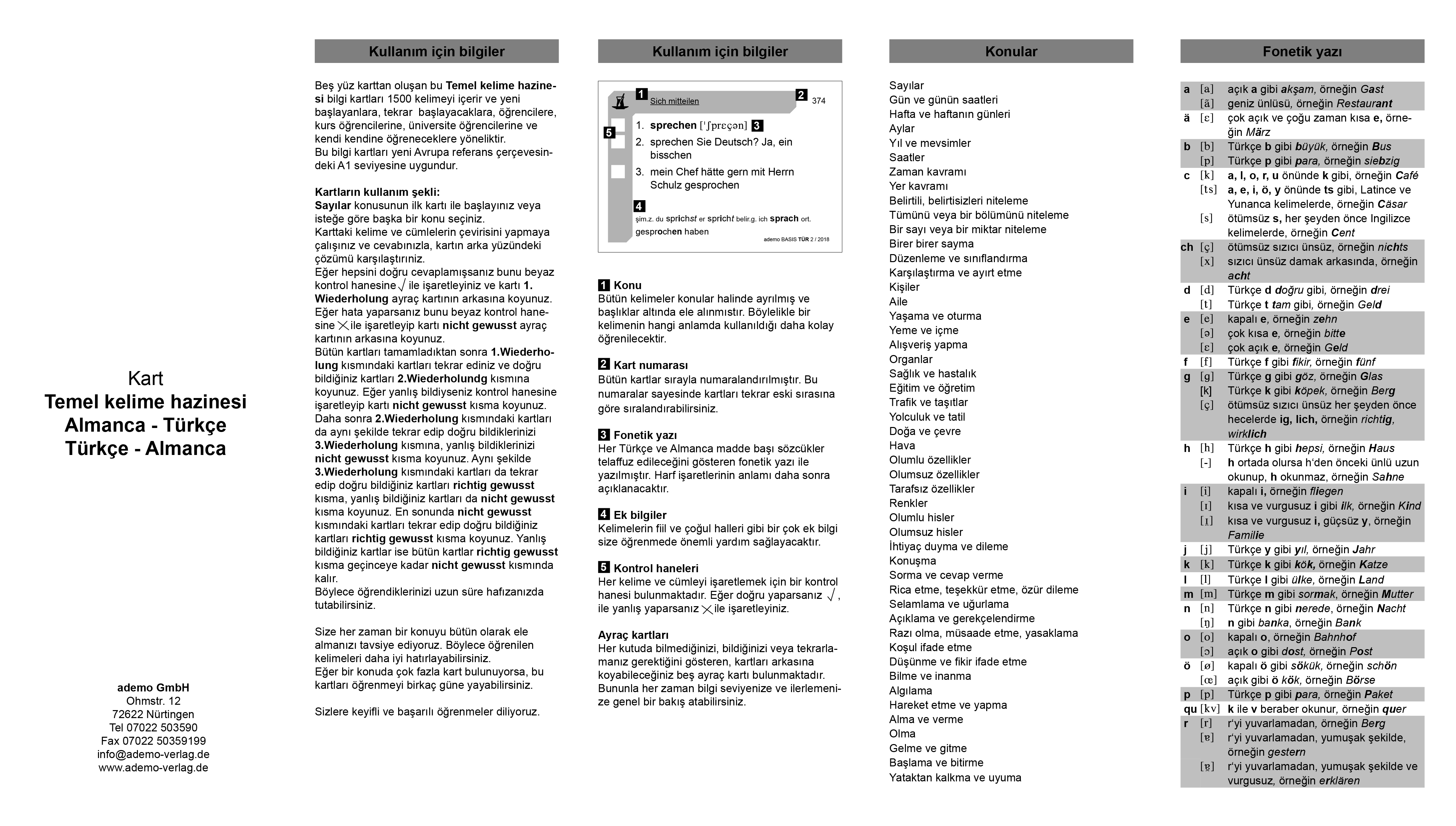 Die Karteikarten Basiswortschatz Türkisch sind lehrbuchunabhängig und enthalten über 1500 Wörter und Beispielsätze auf 500 Karteikarten.Alle Wörter sind nach Themen geordnet. Auf diese Weise lernt man, in welchem Zusammenhang ein Wort eingesetzt wird. Wichtige Zusatzinformationen (z.B. Verbformen, Pluralformen usw.) in beiden Sprachen sind eine große Hilfe beim Lernen.Die Lautschrift zu jedem deutschen und türkischen Stichwort (bilingual) zeigt die richtige Aussprache. Die zweisprachige Bedienungsanleitung erläutert die optimale Benutzung der Karteikarten.Kontrollfelder auf jeder Karte und Registerkarten in jeder Box sorgen für die Selbstkontrolle.Die Karteikarten Basiswortschatz Türkisch orientieren sich am europäischen Referenzrahmen Niveau A1.