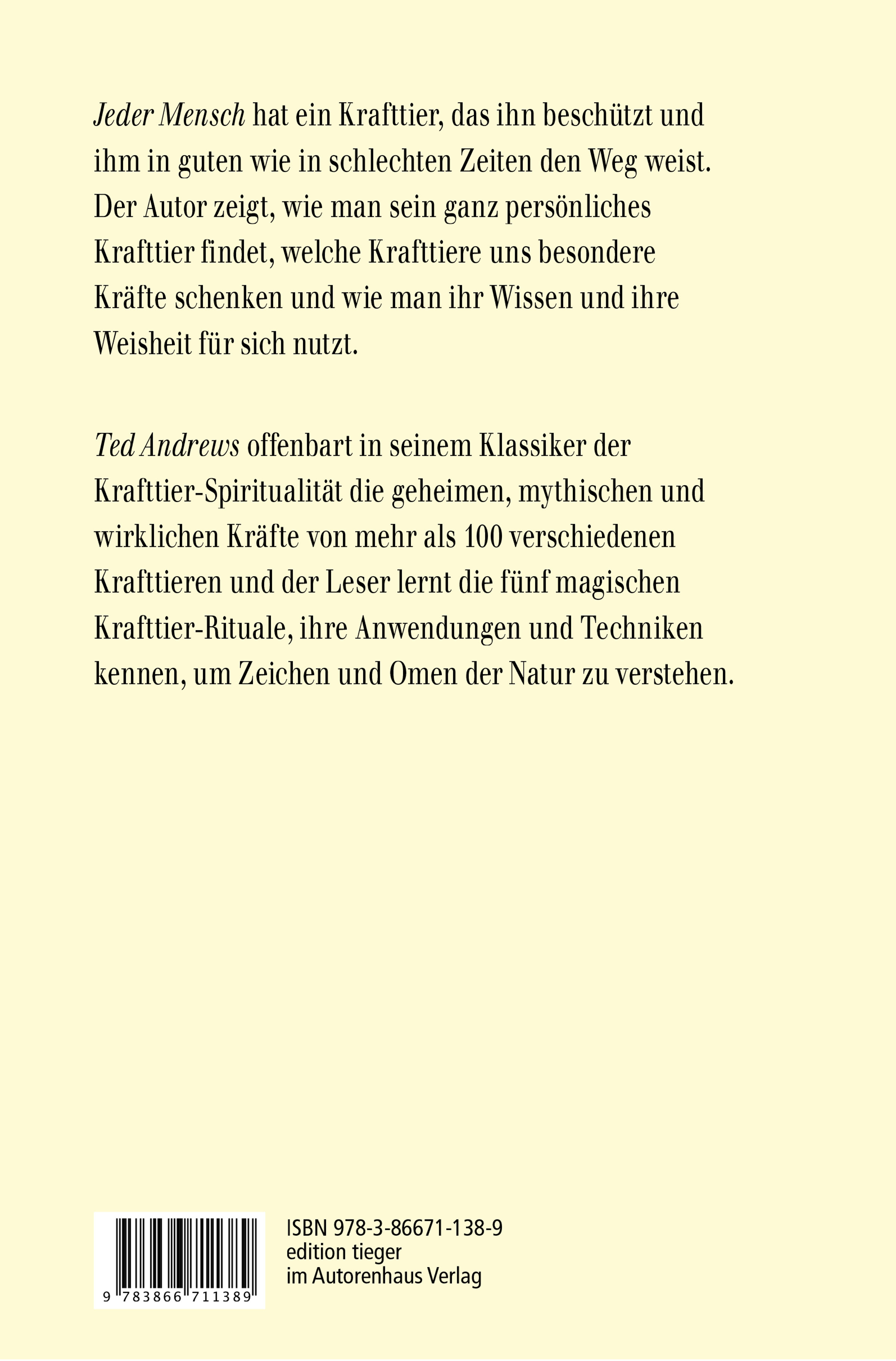 Jeder Mensch hat mindestens ein Krafttier, das ihn beschützt und ihm in guten wie in schlechten Zeiten den Weg weist. Der Autor zeigt, wie man sein ganz persönliches Krafttier findet, welche Krafttiere uns besondere Kräfte schenken und wie man ihr Wissen und ihre Weisheit für sich nutzt. Ted Andrews offenbart in seinem Klassiker der Krafttier-Spiritualität offenbart die geheimen, mythischen und wirklichen Kräfte von mehr als 100 verschiedenen Krafttieren und der Leser lernt die fünf magischen Krafttier-Rituale, ihre Anwendungen und Techniken kennen, um Zeichen und Omen der Natur zu verstehen.