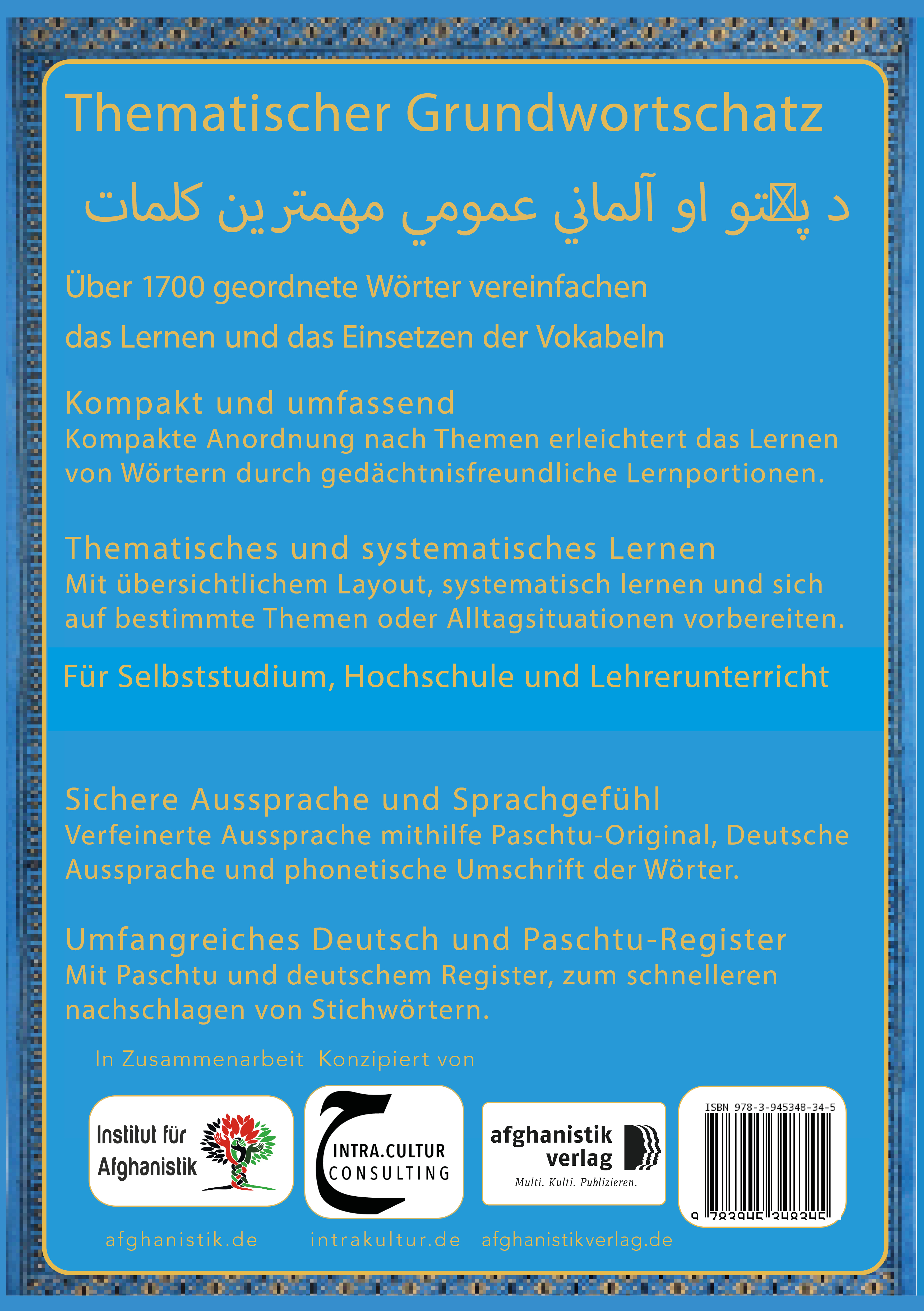 Über 1700 geordnete Wörter vereinfachen das Lernen und die Anwendung der Vokabeln. Kompakte und umfassende Anordnung nach Themen erleichtert das Lernen von Wörter. Zusätzlich unterstützt durch gedächtnisfreundliche Lernportionen.Der Grundwortschatz erleichtert Thematisches und systematisches Lernen: Mit übersichtlichem Layout bereitet er systematisch auf bestimmte Themen und Alltagsituationen vor.1700 Wörter, ausgewählt nach Häufigkeit, Aktualität und Relevanz.Sichere Aussprache und Sprachgefühl : Verfeinerte Aussprache mithilfe von Paschtu Originalsprache, Deutsche- Aussprache und phonetische Umschriften der Wörter.Umfangreiches Deutsch- Paschtu Register und Paschtu-Deutschem Register, zum schnelleren Nachschlagen von Stichwörtern.