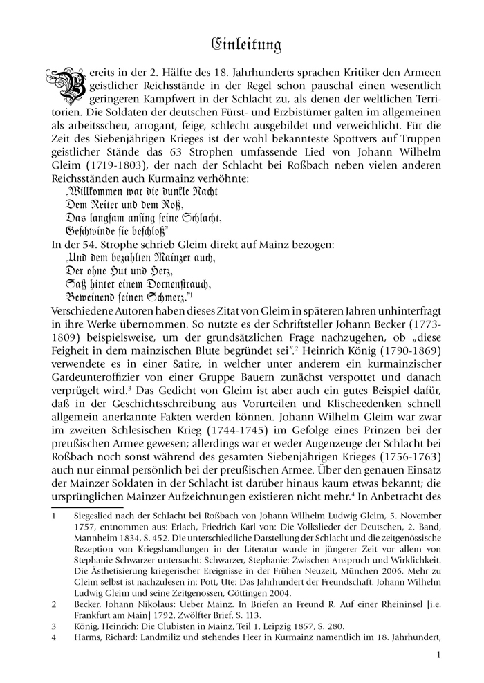 Das Kurmainzer Militär hat in der zweiten Hälfte des 18. Jahrhunderts eine überaus bemerkenswerte Entwicklung gemacht. Von einer Armee, die im Ancien Régime vor allem für repräsentative und polizeiliche Aufgaben innerhalb des Reiches eingesetzt wurde, entwickelte es sich innerhalb weniger Jahre zu einer kampf-erprobten Feldarmee. Neben Reichsexekutionsaufgaben prägte vor allen Dingen die Auseinandersetzung mit der französischen Revolution die Entwicklung der Kurmainzer Armee. Im Kampf gegen die französische Revolutionsarmee und nach dem Verlust der Reichsfestung Mainz vollzog sich in den Jahren 1799 und 1800 der Wandel von der ortsgebundenen, starren Verteidigung hin zu einem flexibel geführten Abwehrkrieg, der deutliche Zeichen des später von Clausewitz so definierten „kleinen Krieges„ trug. Unter Einbeziehung der bewaffneten Landbevölkerung gelang es so der Kurmainzer Armee, über Jahre hinweg einem zahlenmäßig weit überlegenen Gegner zu trotzen.