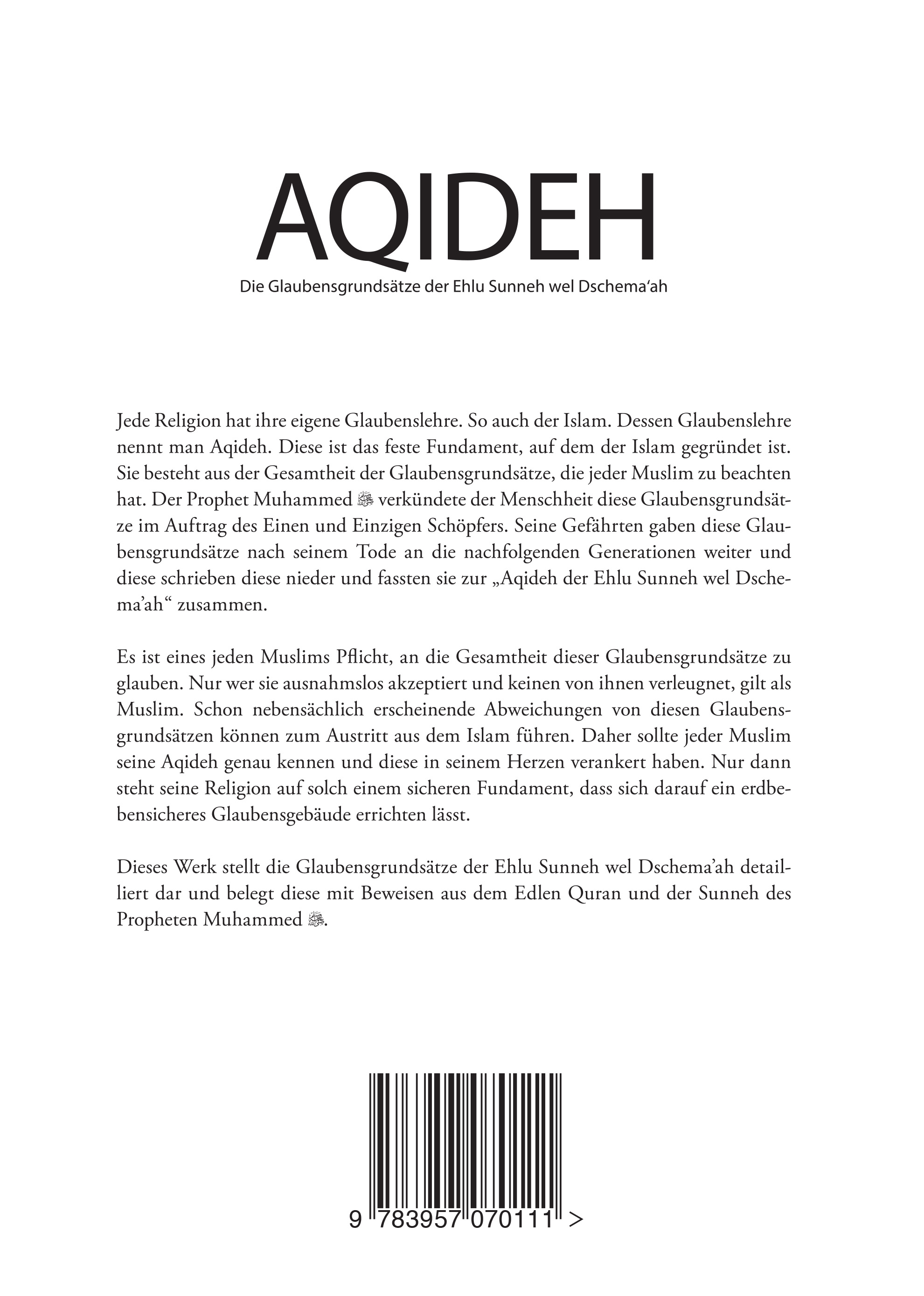 Jede Religion hat ihre eigene Glaubenslehre. So auch der Islam. Dessen Glaubenslehre nennt man Aqideh. Diese ist das feste Fundament, auf dem der Islam gegründet ist. Sie besteht aus der Gesamtheit der Glaubensgrundsätze, die jeder Muslim zu beachten hat. Der Prophet Muhammed (saw) verkündete der Menschheit diese Glaubensgrundsätze im Auftrag des Einen und Einzigen Schöpfers. Seine Gefährten gaben diese Glaubensgrundsätze nach seinem Tode an die nachfolgenden Generationen weiter und diese schrieben diese nieder und fassten sie zur "Aqideh der Ehlu Sunneh wel Dschema'ah" zusammen.Es ist eines jeden Muslim Pflicht, an die Gesamtheit dieser Glaubensgrundsätze zu glauben. Nur wer sie ausnahmslos akzeptiert und keinen von ihnen verleugnet, gilt als Muslim. Schon nebensächlich erscheinende Abweichungen von diesen Glaubensgrundsätzen können zum Austritt aus dem Islam führen. Daher sollte jeder Muslim seine Aqideh genau kennen und diese in seinem Herzen verankert haben. Nur dann steht seine Religion auf solch einem sicheren Fundament, dass sich darauf ein erdbebensicheres Glaubensgebäude errichten lässt.Dieses Werk stellt die Glaubensgrundsätze der Ehlu Sunneh wel Dschema'ah detailliert dar und belegt diese mit Beweisen aus dem Edlen Quran und der Sunneh des Propheten Muhammed (saw).