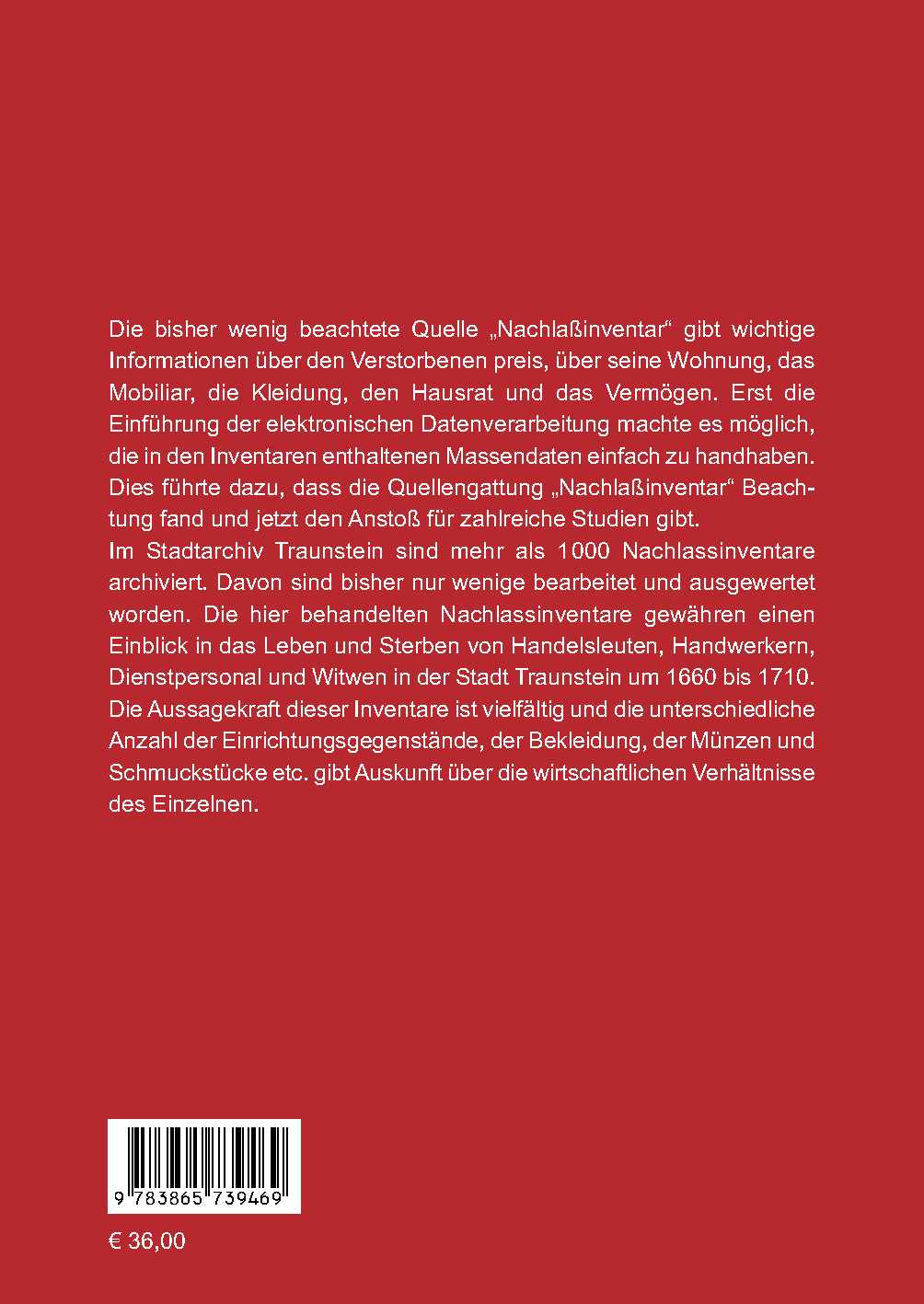 Im Stadtarchiv Traunstein sind mehr als 1 000 Nachlassinventare archiviert. Davon sind bisher nur wenige bearbeitet und ausgewertet worden. Die hier behandelten Nachlassinventare gewähren einen Einblick in das Leben und Sterben von Handelsleuten, Handwerkern, Dienstpersonal und Witwen in der Stadt Traunstein um 1660 bis 1710. Die Aussagekraft dieser Inventare ist vielfältig und die unterschiedliche Anzahl der Einrichtungsgegenstände, der Bekleidung, der Münzen und Schmuckstücke etc. gibt Auskunft über die wirtschaftlichen Verhältnisse des Einzelnen.