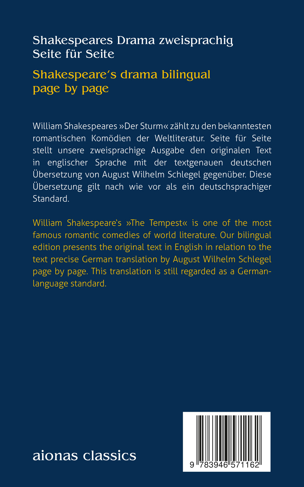 William Shakespeares »Der Sturm« ist eine seiner bekanntesten Romanzen. Seite für Seite stellt die zweisprachige Ausgabe den originalen Text in englischer Sprache der textgenauen deutschen Übersetzung August Wilhelm Schlegels übersichtlich gegenüber. Diese Übersetzung von Schlegel gilt nach wie vor als ein deutschsprachiges Standardwerk.