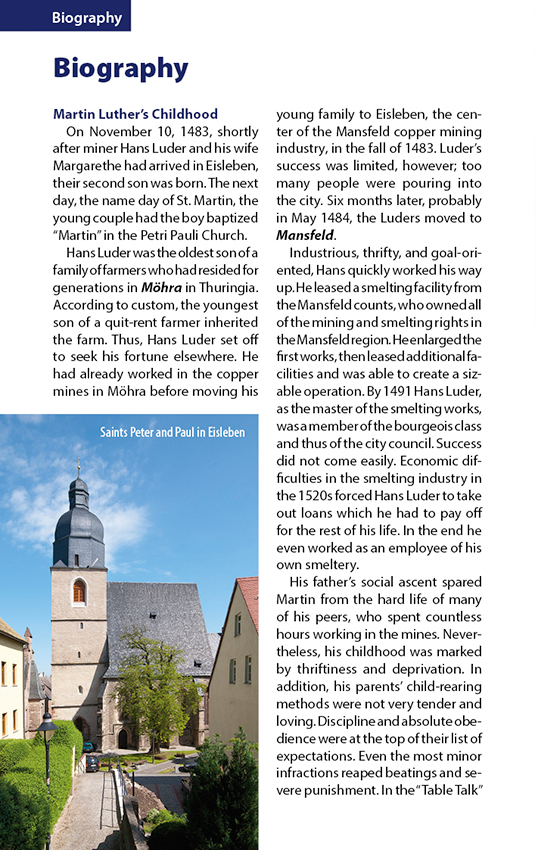 Martin Luther, the"pugnacious theology professor", couldn't have begun to imagine the far-reaching consequences of his actions as he distributed his theses opposing the Church's dealing in indulgences throughout Wittenberg in 1517. His uncompromising stance toward the Roman Curia and his undeterred actions, which were marked by deep inner piety, were to have significant consequences far beyond the borders of the Holy Roman Empire of the German Nation.The fascination this powerful man still holds for us today continues year after year to draw people to the various stations in the life of the great German Reformer.