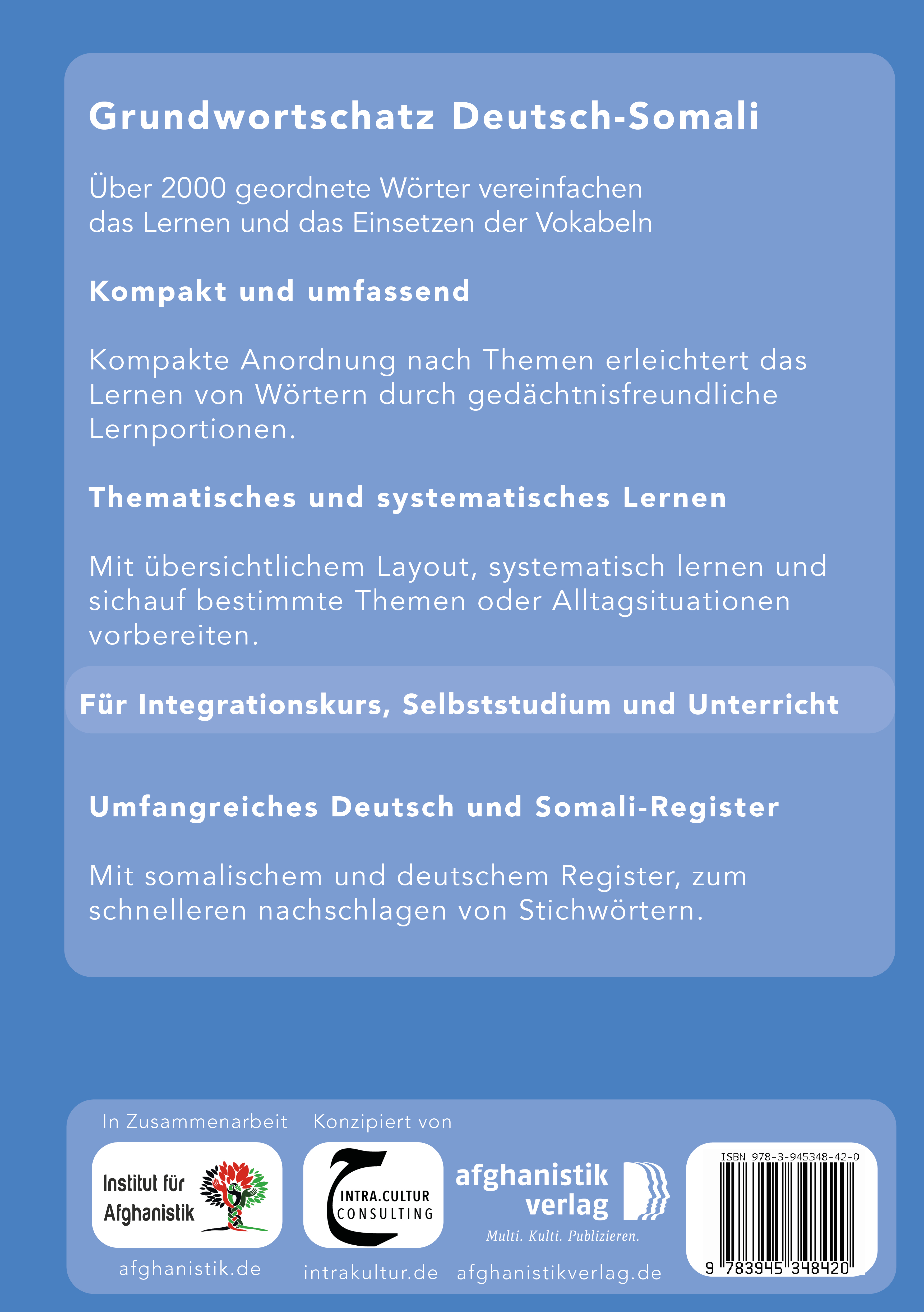 | Schlagworte | Basiswissen • Basiswortschatz • Deutsch als Fremdsprache • Deutsch als Fremdsprache (DaF); Wortschatztrainer für Somalisprechende • Deutsch als Fremdsprache; Wortschatz • Deutsch als Fremdsprache; Wortschatztrainer für Somalisprechende • Fremdsprachenerwerb, Fremdsprachendidaktik • Grundwortschatz • Integrationskurse • Minimalwortschatz • refugees welcome • Selbststudium • Somali • Somaliland • somalisch • Somali; Wortschatz für Kinder • Somali; Wortschatztrainer • Sprache, allgemein & Nachschlagewerke • Sprache, allgemein & Nachschlagewerke • Vokabeln |