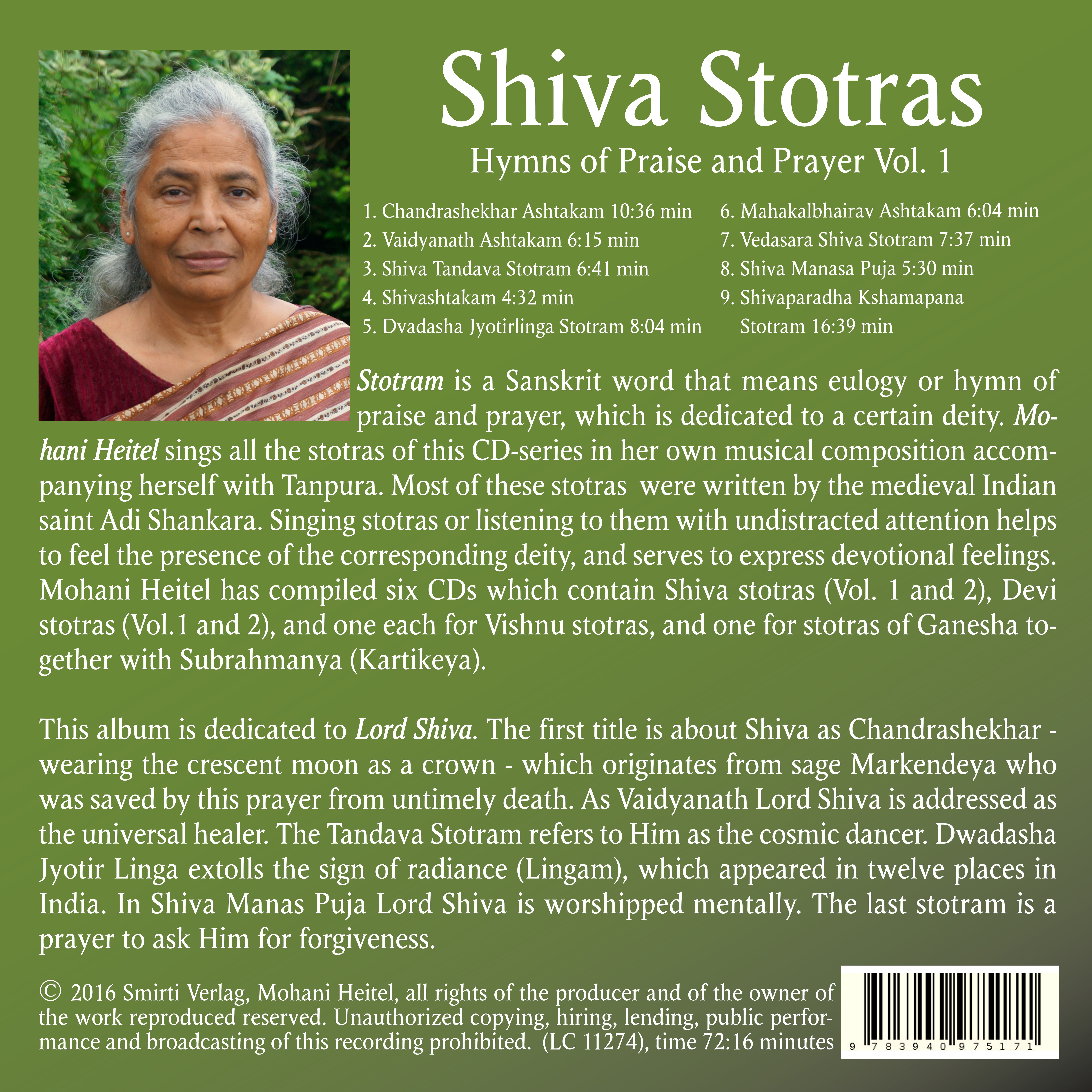 Mohani Heitel has compiled six CDs which contain Shiva stotras (Vol. 1 and 2), Devi