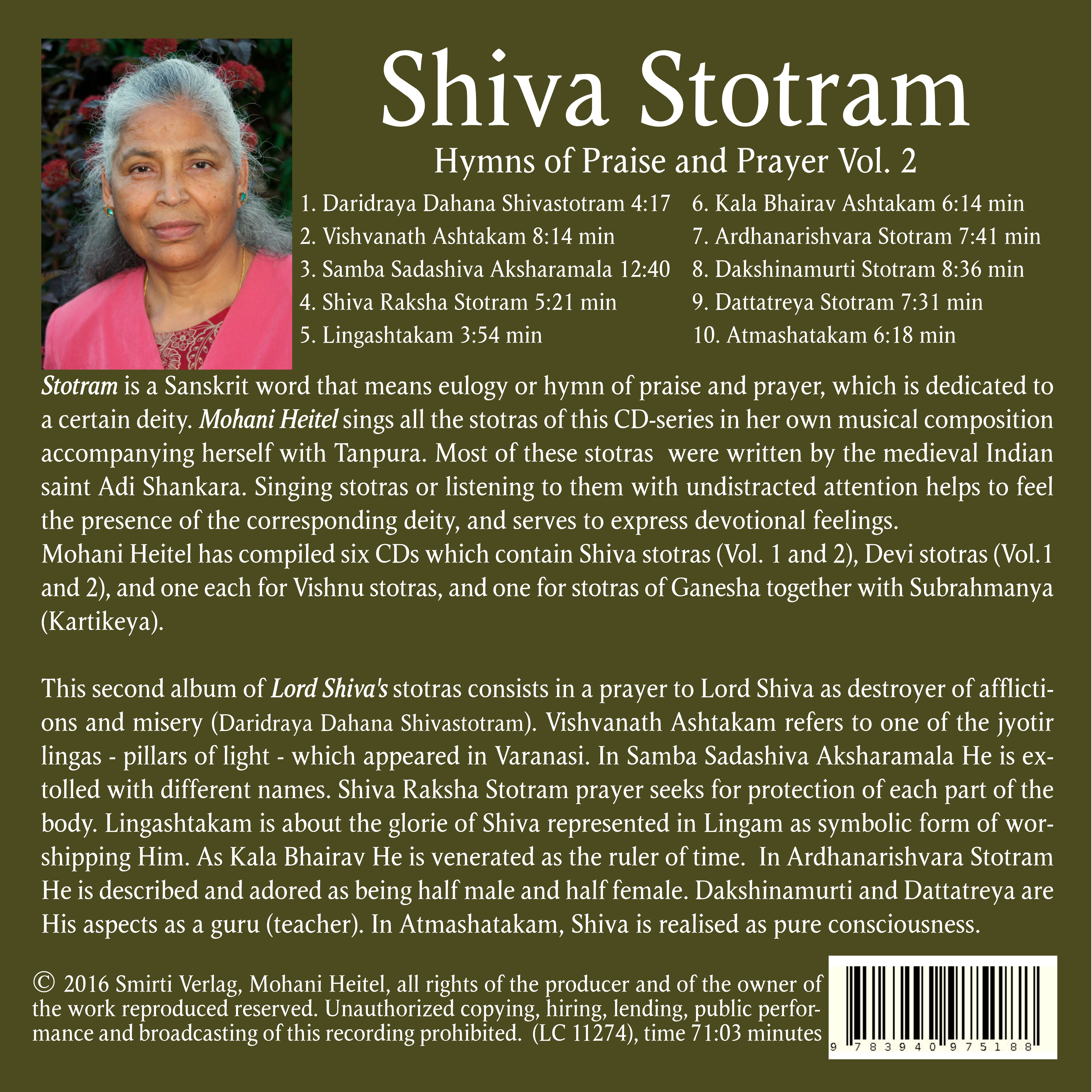 Stotram is a Sanskrit word that means eulogy or hymn of praise and prayer, which is dedicated to a certain deity. Mohani Heitel sings all the stotras of this CD-series in her own musical composition accompanying herself with Tanpura. Most of these stotras were written by the medieval Indian saint Adi Shankara. Singing stotras or listening to them with undistracted attention helps to feel the presence of the corresponding deity, and serves to express devotional feelings.