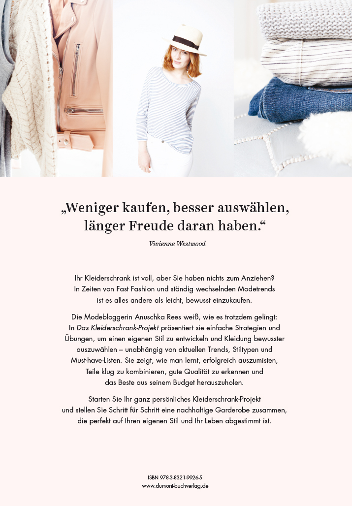 »In ihrem Buch ›Das Kleiderschrank-Projekt‹ gibt Anuschka Rees nicht vor, welche Teile jede Frau unbedingt in ihrem Schrank hängen haben sollte, sondern leitet dazu an, ganz individuell herauszufinden, was man wirklich braucht – und was nicht.«