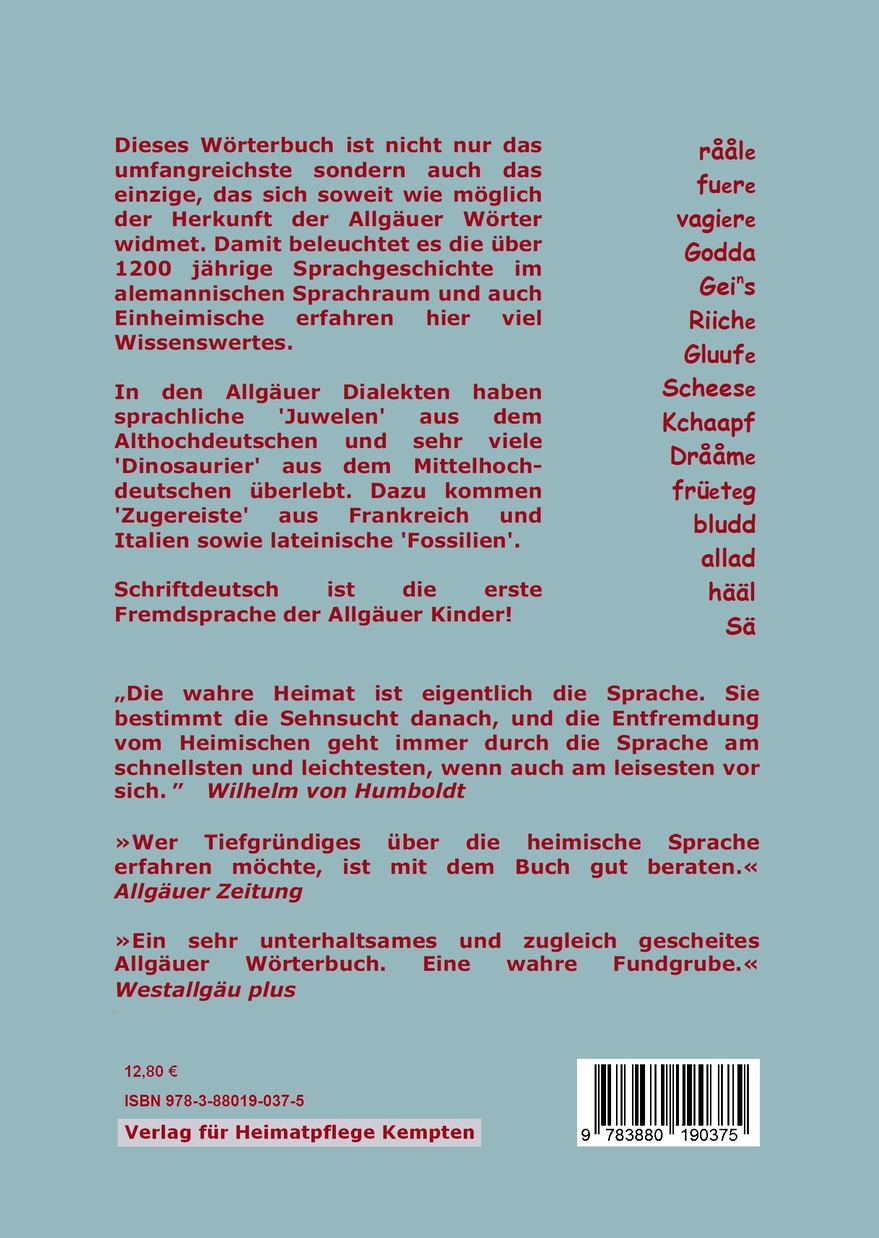 Der umfangreiche Allgäuer, mit ca. 2500 Wörtern, wird nicht nur fundiert erklärt, sondern auch seine Herkunft und die Etymologie der meisten Wörter wird beschrieben.