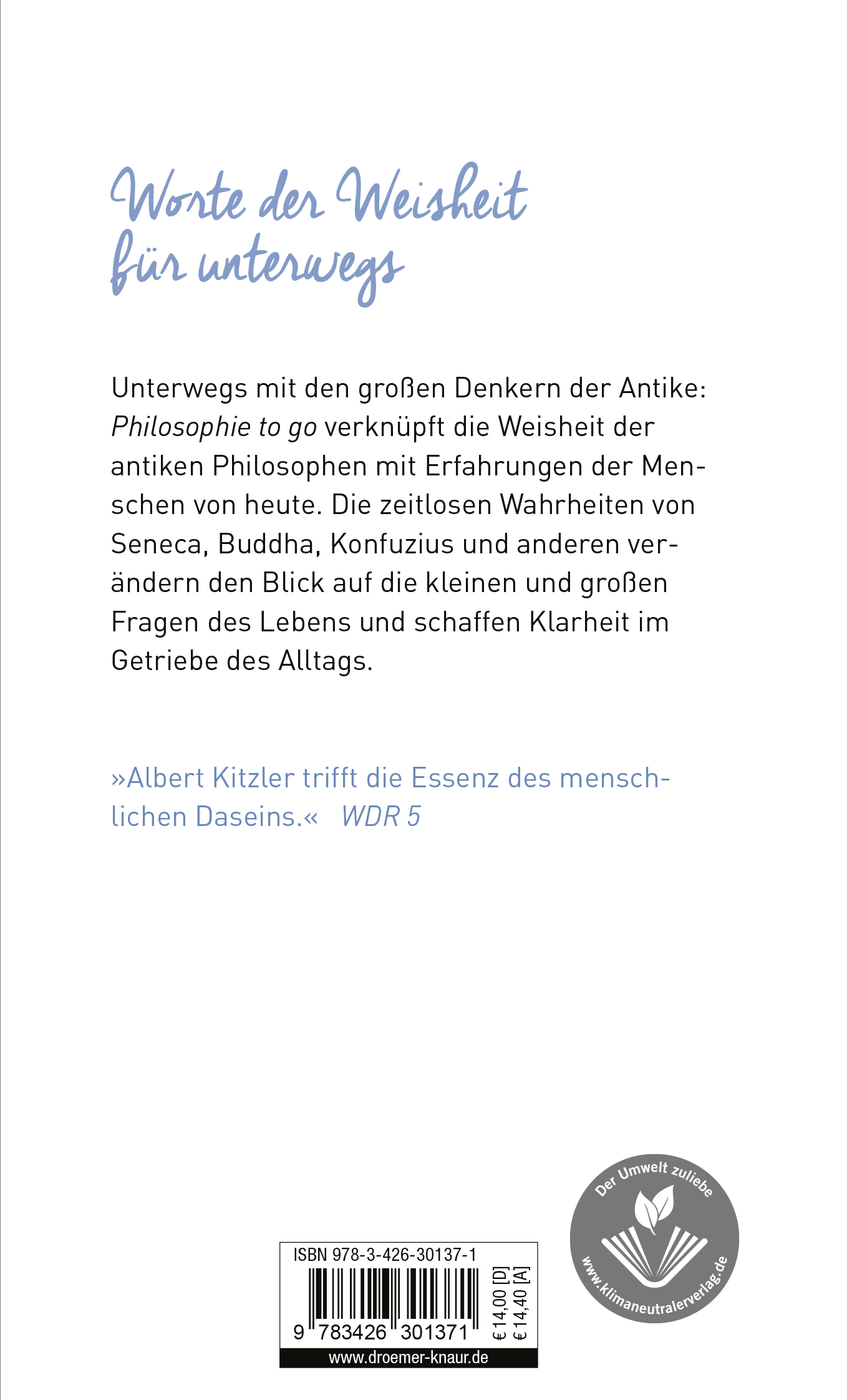 Unterwegs sein mit den großen Denkern der Antike: Albert Kitzler präsentiert die Weisheit der großen Philosophen aus West und Ost, aus Griechenland, Rom, Indien und China, in kleinen Häppchen und verknüpft sie mit Alltags-Erfahrungen von heute. So gewinnen die Leser neue Sichtweisen auf die kleinen und großen Fragen des Lebens und finden ihre Mitte im Getriebe des Alltags. "Philosophie to go" - das sind Auszeiten und kleine Pausen mit Seneca, Buddha, Konfuzius und vielen anderen, die beim Innehalten helfen und wichtige Impulse für die alltägliche Lebensführung geben.