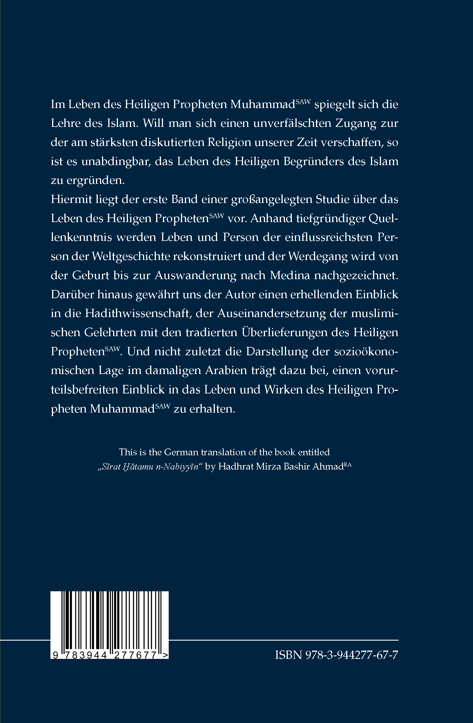 uns der Autor eine Vorstellung der sozialen, kulturellen und ökonomischen Umstände im antiken Arabien. Er zeichnet ein Gesellschaftspanorama, das es uns erlaubt, die Person des Heiligen Propheten (saw) im Lichte seiner sozialen Umgebung besser zu verstehen. Detailreich rekonstruiert der Autor sodann die frühe Kindheit und Jugend des Propheten (saw), schildert einschneidende Ereignisse und lässt uns teilhaben an der Berufung des einsamen Gottessuchers zum auserwählten Propheten für die ganze Menschheit. Der Einblick in die sozioökonomische Struktur des damaligen Arabiens erlaubt es uns auch, besser zu verstehen, warum der Heilige Prophet (saw) nach der Verkündung seines prophetischen Anspruchs rigoroser und gewaltsamer Opposition ausgesetzt war. Wir lernen sodann auch zu verstehen, weshalb der Prophet (saw) mitsamt seiner kleinen Gemeinde nach Medina auswandern musste; das Ereignis, mit dem der uns hier vorliegende erste Band der Biografie endet.