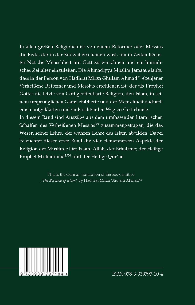 „Die Essenz des Islam“ ist die deutsche Ausgabe einer Sammlung von Auszügen aus den Schriften, Ansprachen und Bekanntmachungen des Verheißenen Messias, Hadhrat Mirza Ghulam Ahmad (as) von Qadian. 1889 erhob Hadhrat Ahmad (as) den Anspruch, jener Messias und Mahdi zu sein, dessen Ankunft in der Endzeit nicht nur im Islam sondern auch in anderen Religionen prophezeit wurde. Die Schriften des Verheißenen Messias sind für all jene ein Weckruf, die glauben, dass die Offenbarungen und Zeichen Gottes eine Angelegenheit längst vergangener Tage darstellen. Seine Schriften sind angefüllt mit Erörterungen über die Etablierung einer lebendigen Beziehung zu Allah, die Funktion, die Offenbarungen bei der Erlangung dieses Ziels innehaben, und der absoluten Notwendigkeit, der Lehre des Heiligen Propheten zu folgen und nach den Lehren des Heiligen Qur‘an zu leben. Gemäß den Prophezeiungen des Heiligen Propheten Muhammad (saw) sind sie jene spirituellen Schätze, die, verfasst mit göttlichem Beistand, der Menschheit auch in dieser Zeit den Zugang zu den leuchtenden Lehren des Islams und des Heiligen Qur’an ermöglichen.