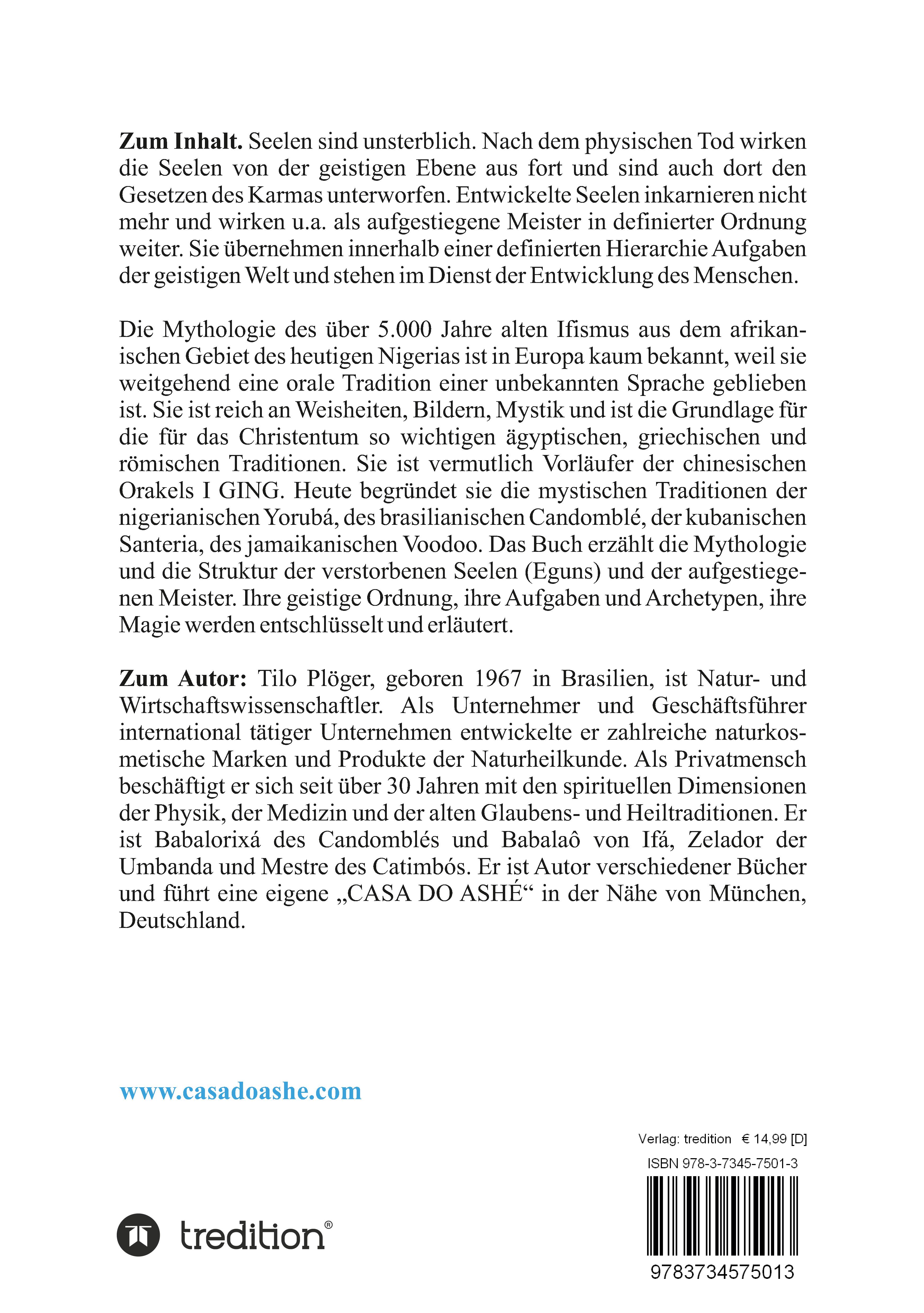 Seelen sind unsterblich. Nach dem physischen Tod wirken die Seelen von der geistigen Ebene aus fort und sind auch dort den Gesetzen des Karmas unterworfen. Entwickelte Seelen inkarnieren nicht mehr und wirken u. a. als aufgestiegene Meister in definierter Ordnung weiter. Sie übernehmen innerhalb einer definierten Hierarchie Aufgaben der geistigen Welt und stehen im Dienst der Entwicklung des Menschen. Die Mythologie des über 5.000 Jahre alten Ifismus aus dem afrikanischen Gebiet des heutigen Nigerias ist in Europa kaum bekannt, weil sie weitgehend eine orale Tradition einer unbekannten Sprache geblieben ist. Sie ist reich an Weisheiten, Bildern, Mystik und ist die Grundlage für die für das Christentum so wichtigen ägyptischen, griechischen und römischen Traditionen. Sie ist vermutlich Vorläufer der chinesischen Orakels I GING. Heute begründet sie die mystischen Traditionen der nigerianischen Yorubá, des brasilianischen Candomblé, der kubanischen Santeria, des jamaikanischen Voodoo. Das Buch erzählt die Mythologie und die Struktur der verstorbenen Seelen (Eguns) und der aufgestiegenen Meister. Ihre geistige Ordnung, ihre Aufgaben und Archetypen, ihre Magie werden entschlüsselt und erläutert.
