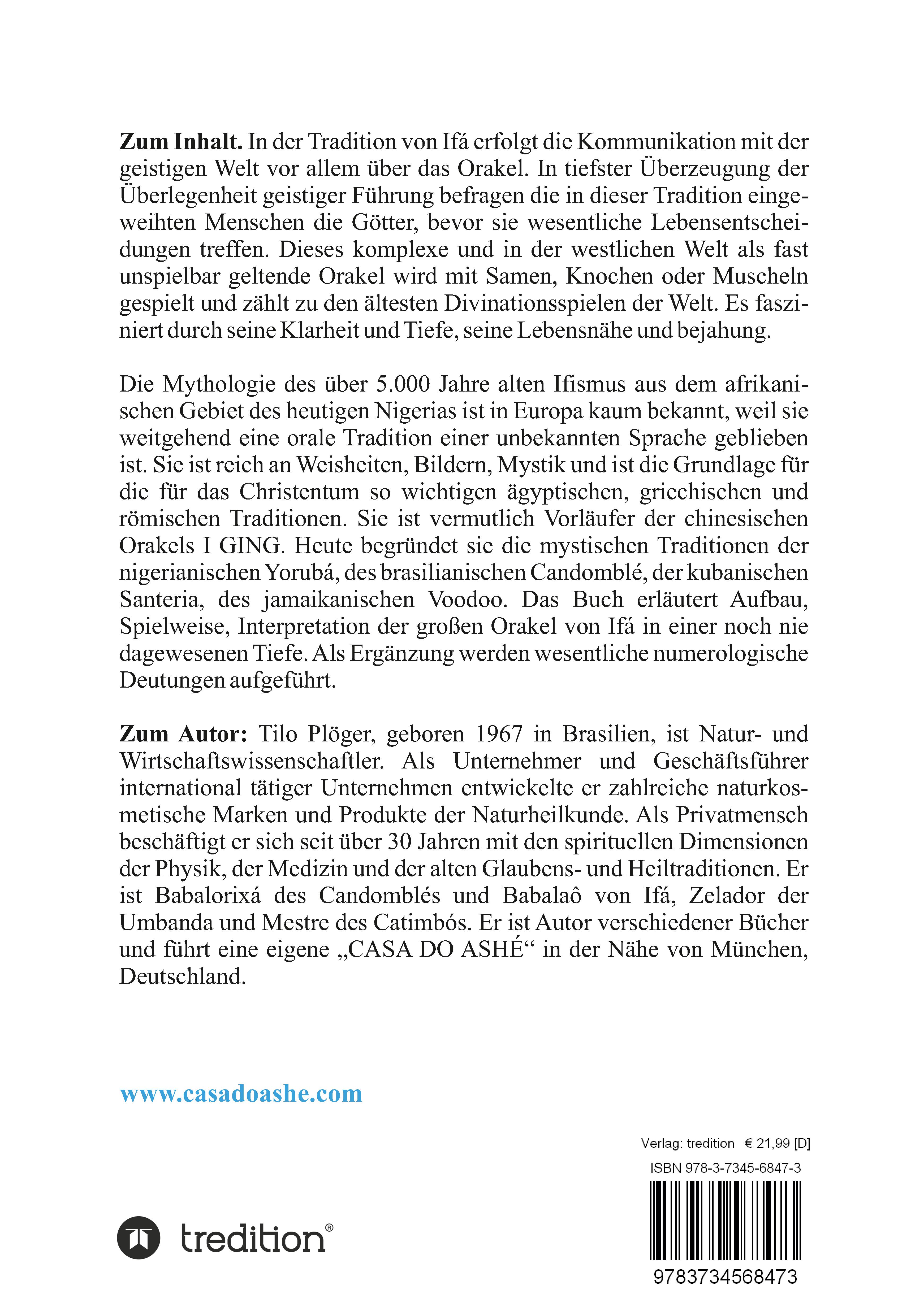 Tilo Plöger, born in Brazil in 1967, is a scientist and economist. As an entrepreneur and managing director of international companies, he developed numerous natural cosmetic brands and naturopathic products. As a private person he has been dealing with the spiritual dimensions of physics, medicine and the old faith and healing traditions for over 30 years. He is Babalorisha of Candomblé and Babalawo of Ifá, Zelador of Umbanda and Mestre of Catimbó, and author of various books. He runs his own "CASA DO ASHÉ" near Munich, Germany.