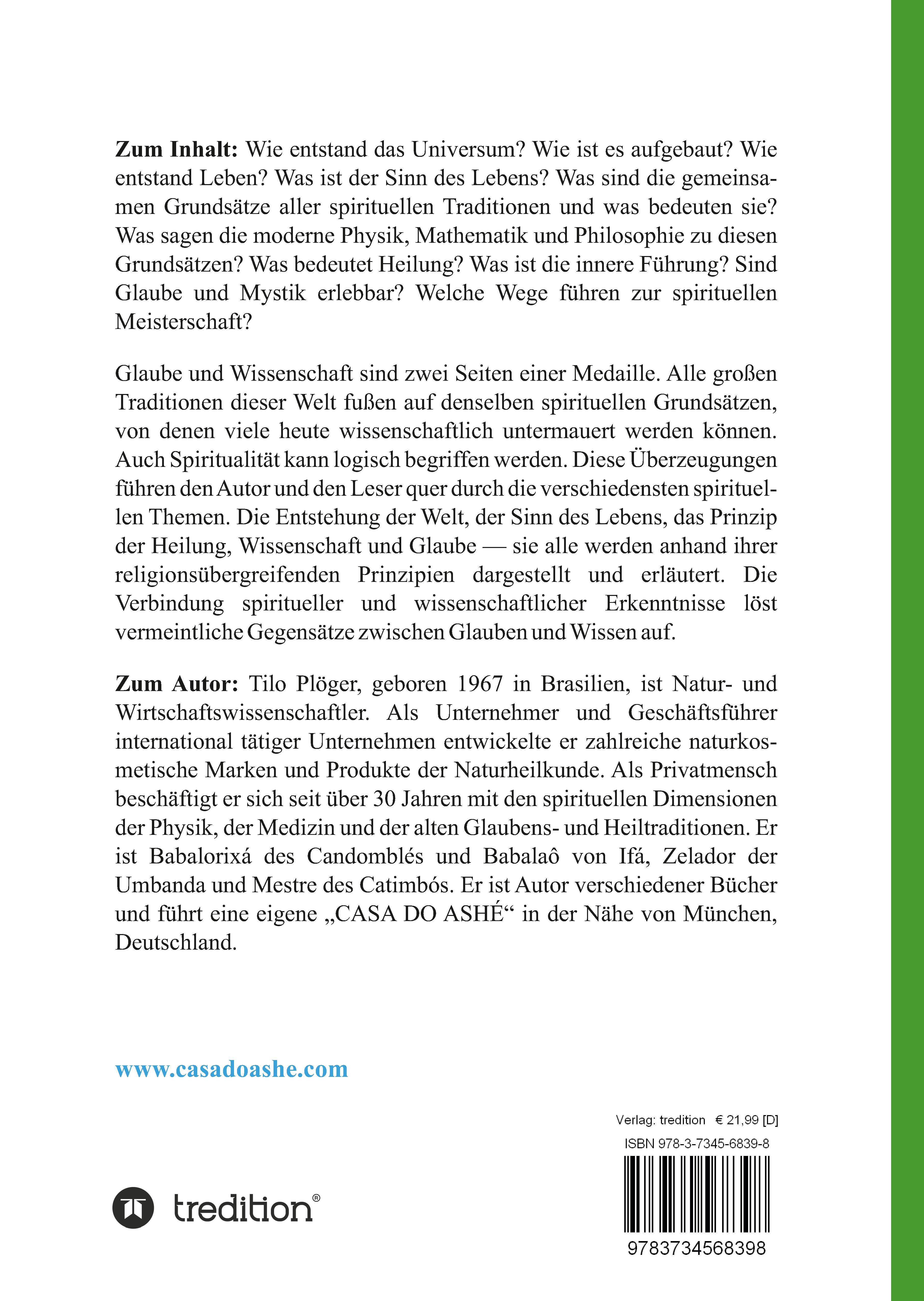 Wie entstand das Universum? Wie ist es aufgebaut? Wie entstand Leben? Was ist der Sinn des Lebens? Was sind die gemeinsamen Grundsätze aller spirituellen Traditionen und was bedeuten sie? Was sagen die moderne Physik, Mathematik und Philosophie zu diesen Grundsätzen? Was bedeutet Heilung? Was ist die innere Führung? Sind Glaube und Mystik erlebbar? Welche Wege führen zur spirituellen Meisterschaft? Glaube und Wissenschaft sind zwei Seiten einer Medaille. Alle großen Traditionen dieser Welt fußen auf denselben spirituellen Grundsätzen, von denen viele heute wissenschaftlich untermauert werden können. Auch Spiritualität kann logisch begriffen werden. Diese Überzeugungen führen den Autor und den Leser quer durch die verschiedensten spirituellen Themen. Die Entstehung der Welt, der Sinn des Lebens, das Prinzip der Heilung, Wissenschaft und Glaube - sie alle werden anhand ihrer religionsübergreifenden Prinzipien dargestellt und erläutert. Die Verbindung spiritueller und wissenschaftlicher Erkenntnisse löst vermeintliche Gegensätze zwischen Glauben und Wissen auf.