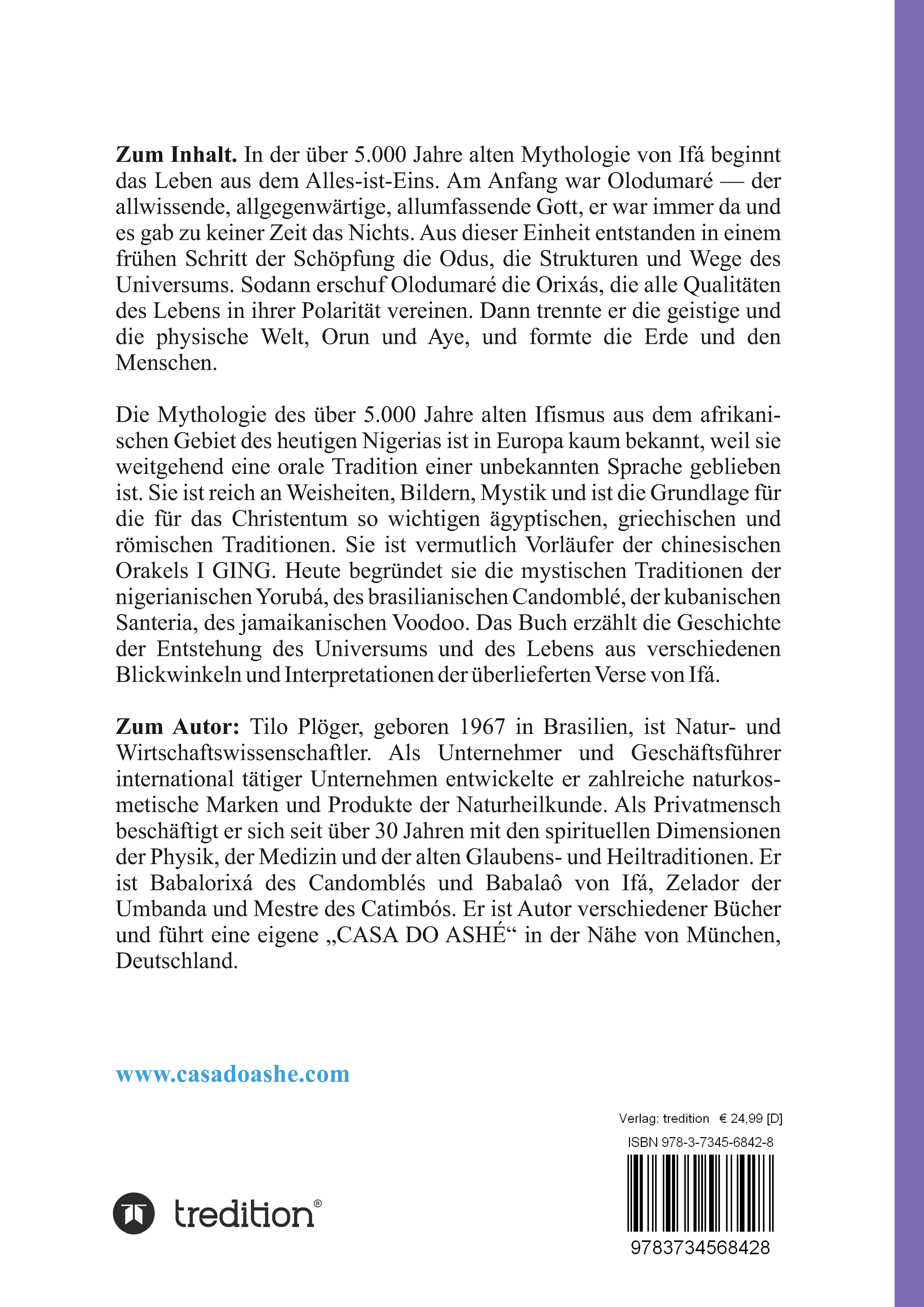 In der über 5.000 Jahre alten Mythologie von Ifá beginnt das Leben aus dem Alles-ist-Eins. Am Anfang war Olodumaré - der allwissende, allgegenwärtige, all-umfassende Gott, er war immer da und es gab zu keiner Zeit das Nichts. Aus dieser Einheit entstanden in einem frühen Schritt der Schöpfung die Odus, die Strukturen und Wege des Universums. Sodann erschuf Olodumaré die Orixás, die alle Qualitäten des Lebens in ihrer Polarität vereinen. Dann trennte er die geistige und die physische Welt, Orun und Aye, und formte die Erde und den Menschen. Die Mythologie des über 5.000 Jahre alten Ifismus aus dem afrikanischen Gebiet des heutigen Nigerias ist in Europa kaum bekannt, weil sie weitgehend eine orale Tradition einer unbekannten Sprache geblieben ist. Sie ist reich an Weisheiten, Bildern, Mystik und ist die Grundlage für die für das Christentum so wichtigen ägyptischen, griechischen und römischen Traditionen. Sie ist vermutlich Vorläufer der chinesischen Orakels I GING. Heute begründet sie die mystischen Traditionen der nigerianischen Yorubá, des brasilianischen Candomblé, der kubanischen Santeria, des jamaikanischen Voodoo. Das Buch erzählt die Geschichte der Entstehung des Universums und des Lebens aus verschiedenen Blickwinkeln und Interpretationen der überlieferten Verse von Ifá.