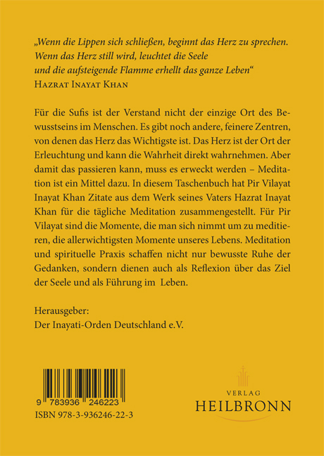 Hazrat Inayat Khan vermittelt die allertiefsten Einsichten mit nur wenigen einfachen Worten. Jeder Satz in diesem Buch öffnet ein Fenster für Ausblicke in Sinn und Bedeutung. Lesen Sie jeden Tag einen Textabschnitt und ein frischer Hauch himmlischer Weisheit wird Sie beleben. Mögen Sie tief gehende Inspiration daraus gewinnen, liebe Leserinnen und Leser! Pir Zia Inayat-Khan