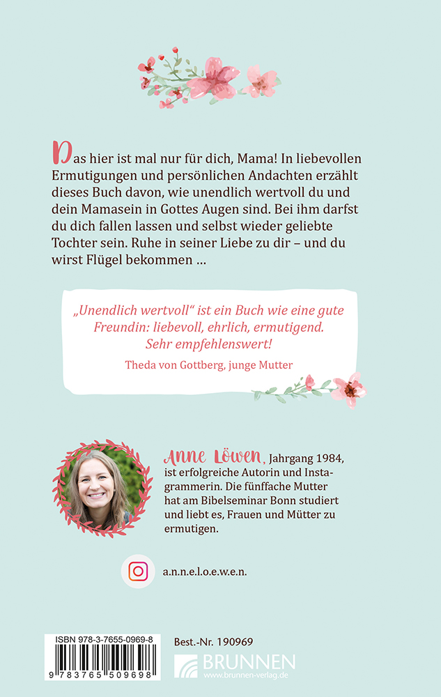 Hier gehts mal nur um dich, Mama! In liebevollen Ermutigungen und persönlichen Andachten erzählt dieses Buch davon, wie unendlich wertvoll du und dein Mamasein in Gottes Augen sind. Bei ihm darfst du dich fallen lassen und selbst wieder geliebte Tochter sein. Ruhe in seiner Liebe zu dir - und du wirst Flügel bekommen ... Unendlich wertvoll ist ein Buch wie eine gute Freundin: liebevoll, ehrlich, ermutigend. Sehr empfehlenswert! Theda von Gottberg, junge Mutter