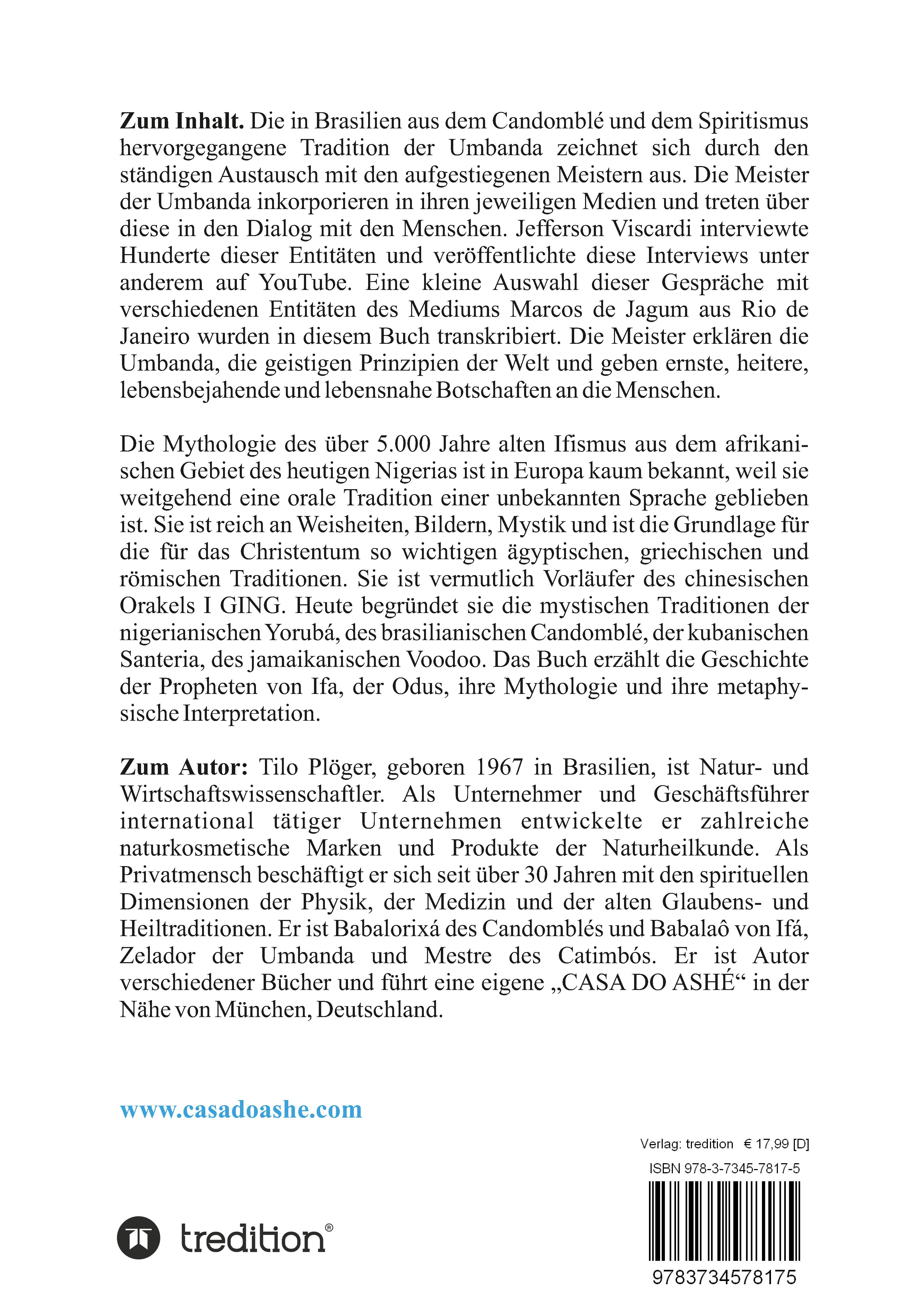 Die in Brasilien aus dem Candomblé und dem Spiritismus hervorgegangene Tradition der Umbanda zeichnet sich durch den ständigen Austausch mit den aufgestiegenen Meistern aus. Die Meister der Umbanda inkorporieren in ihren jeweiligen Medien und treten über diese in den Dialog mit den Menschen. Jefferson Viscardi interviewte Hunderte dieser Entitäten und veröffentlichte diese Interviews unter anderem auf YouTube. Eine kleine Auswahl dieser Gespräche mit verschiedenen Entitäten des Mediums Marcos de Jagum aus Rio de Janeiro wurden in diesem Buch transkribiert. Die Meister erklären die Umbanda, die geistigen Prinzipien der Welt und geben ernste, heitere, lebensbejahende und lebensnahe Botschaften an die Menschen. Die Mythologie des über 5.000 Jahre alten Ifismus aus dem afrikanischen Gebiet des heutigen Nigerias ist in Europa kaum bekannt, weil sie weitgehend eine orale Tradition einer unbekannten Sprache geblieben ist. Sie ist reich an Weisheiten, Bildern, Mystik und ist die Grundlage für die für das Christentum so wichtigen ägyptischen, griechischen und römischen Traditionen. Sie ist vermutlich Vorläufer des chinesischen Orakels I GING. Heute begründet sie die mystischen Traditionen der nigerianischen Yorubá, des brasilianischen Candomblé, der kubanischen Santeria, des jamaikanischen Voodoo. Das Buch erzählt die Geschichte der Propheten von Ifa, der Odus, ihre Mythologie und ihre metaphysische Interpretation.