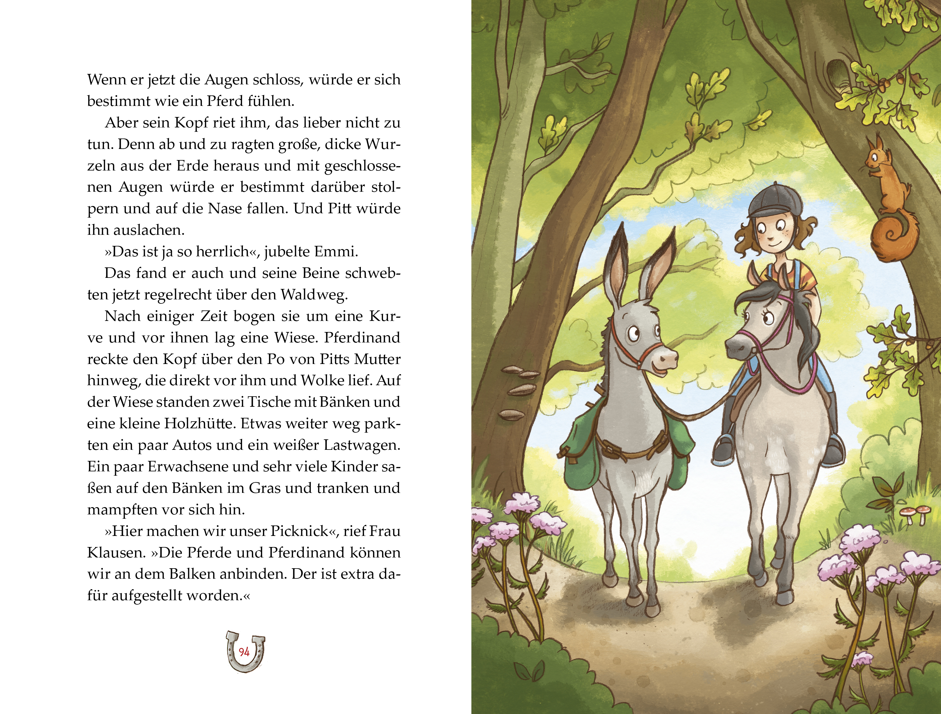Eseljunge Pferdinand muss zugeben: Das mit dem Pferd-Werden hatte er sich irgendwie einfacher vorgestellt. Immerhin ist der Anfang schon mal gemacht - mit seinem neuen Namen. Und bei der Reitstunde auf dem Klausenhof darf Pferdinand sich schon mal als Handesel ... äh Handpferd natürlich, versuchen. Blöd nur, dass der arrogante Hengst Pitt auch dabei ist und sich über sein Iahen lustig macht. Ob Pferdinand wohl heimlich Wieherunterricht nehmen kann? Aber dann fällt ausgerechnet Pitt in die Hände gemeiner Verbrecher - was für ein Glück, dass Pferdinand das Iahen noch nicht verlernt hat ...