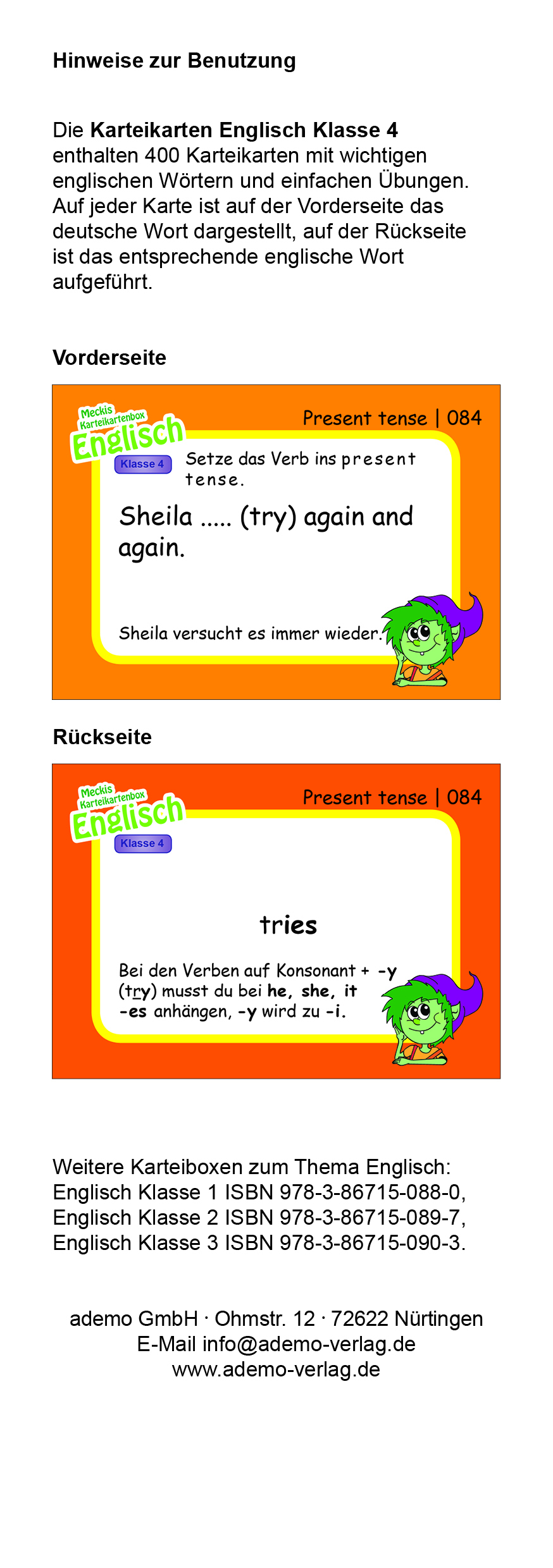 Die Karteibox Englisch Klasse 4 mit tollen Stickern enthält 400 farbige Karteikarten mit wichtigen englischen Wörtern und einfachen Übungen. Erklärungskarten vor jedem Thema enthalten wichtige Erklärungen und Tipps. In der Karteibox befinden sich zusätzlich 5 Registerkarten, unter denen Sie die Karten ablegen können. Diese Kontrollmöglichkeiten verschaffen Ihnen einen umfassenden Überblick über den Kenntnissstand und die Lernfortschritte Ihres Kindes und gewährleisten, dass das Gelernte wirklich richtig sitzt.