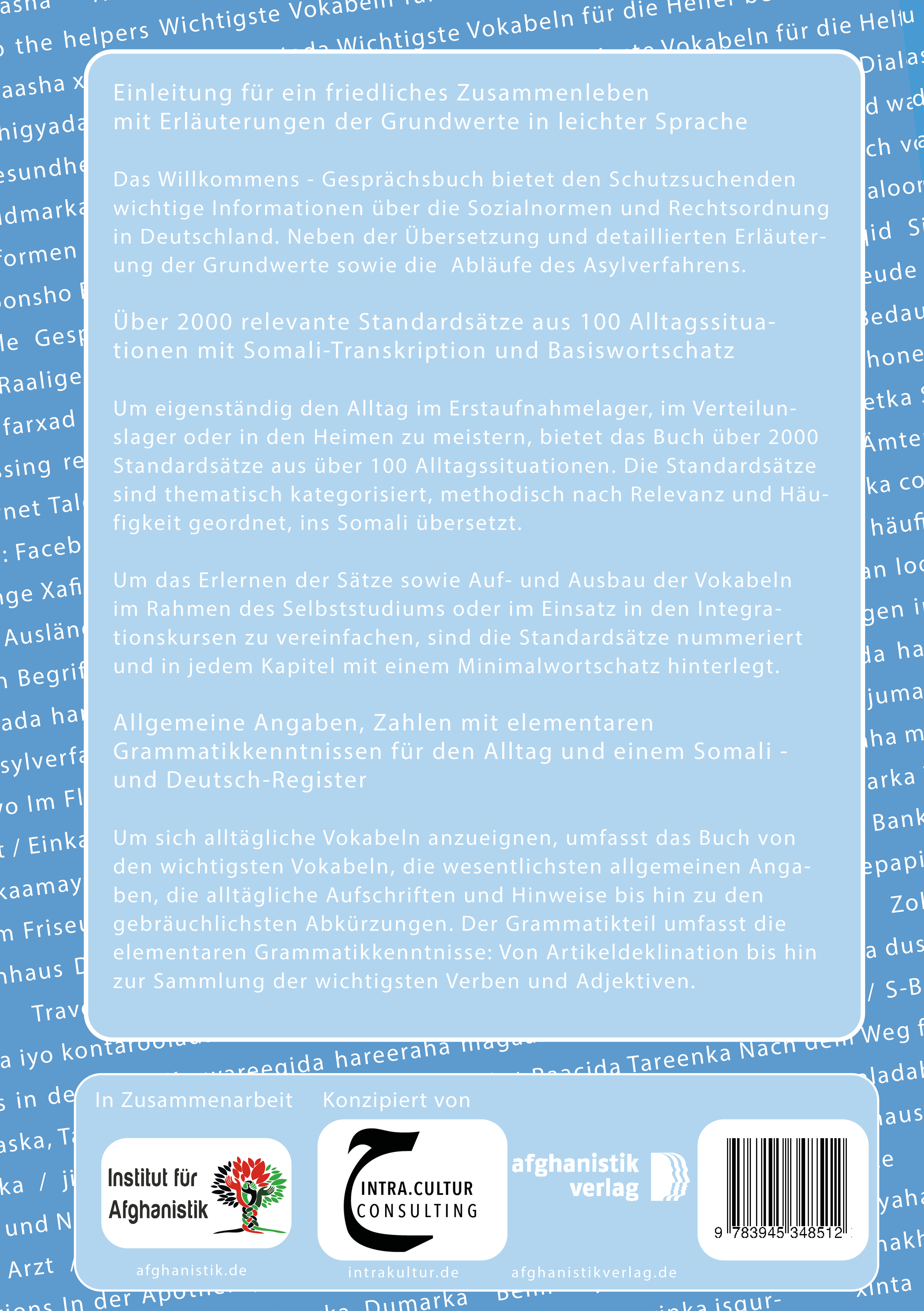 Einleitung für ein friedliches Zusammenlebenmit Erläuterungen der Grundwerte in leichter SpracheDas Willkommens - Gesprächsbuch bietet den Schutzsuchendenwichtige Informationen über die Sozialnormen und Rechtsordnung in Deutschland. Neben der Übersetzung und detaillierten Erläuterung der Grundwerte, erfahren die Schutzsuchenden auf Deutsch und Somali alles über die Vorteile der Grundwerte.Über 2000 relevante Standardsätze aus 100 Alltagssituationen mit BasiswortschatzUm eigenständig den Alltag im Erstaufnahmelager, im Verteilunslager oder in den Heimen zu meistern, bietet das Buch über 2000 Standardsätze aus über 100 Alltagssituationen. Die Standardsätze sind thematisch kategorisiert und methodisch nach Relevanz und Häufigkeit geordnet.Um das Erlernen der Sätze sowie Auf- und Ausbau der Vokabeln im Rahmen des Selbststudiums oder im Einsatz in den Integrationskursen zu vereinfachen, sind die Standardsätze nummeriert und in jedem Kapitel mit einem Minimalwortschatz hinterlegt.Allgemeine Angaben, Zahlen mit elementaren Basiswortschatz für den Alltag und einem Somali - und Deutsch-RegisterUm sich alltägliche Vokabeln anzueignen, umfasst das Buch die wichtigsten Vokabeln, die wesentlichsten allgemeinen Angaben, die alltägliche Vorschriften und Hinweise, bis hin zu dengebräuchlichsten Abkürzungen. Der Grammatikteil umfasst Artikeldeklination und eine Sammlung der wichtigsten Verben und Adjektiven.