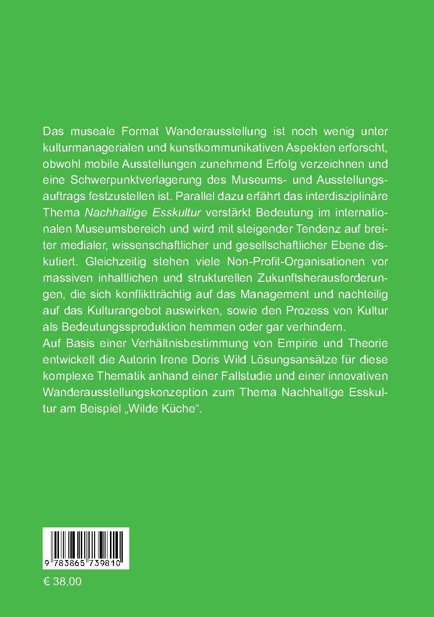Auf Basis einer Verhältnisbestimmung von Empirie und Theorie entwickelt die Autorin Irene Doris Wild Lösungsansätze für diese komplexe Thematik anhand einer Fallstudie und einer innovativen Wanderausstellungskonzeption zum Thema Nachhaltige Esskultur am Beispiel "Wilde Küche".