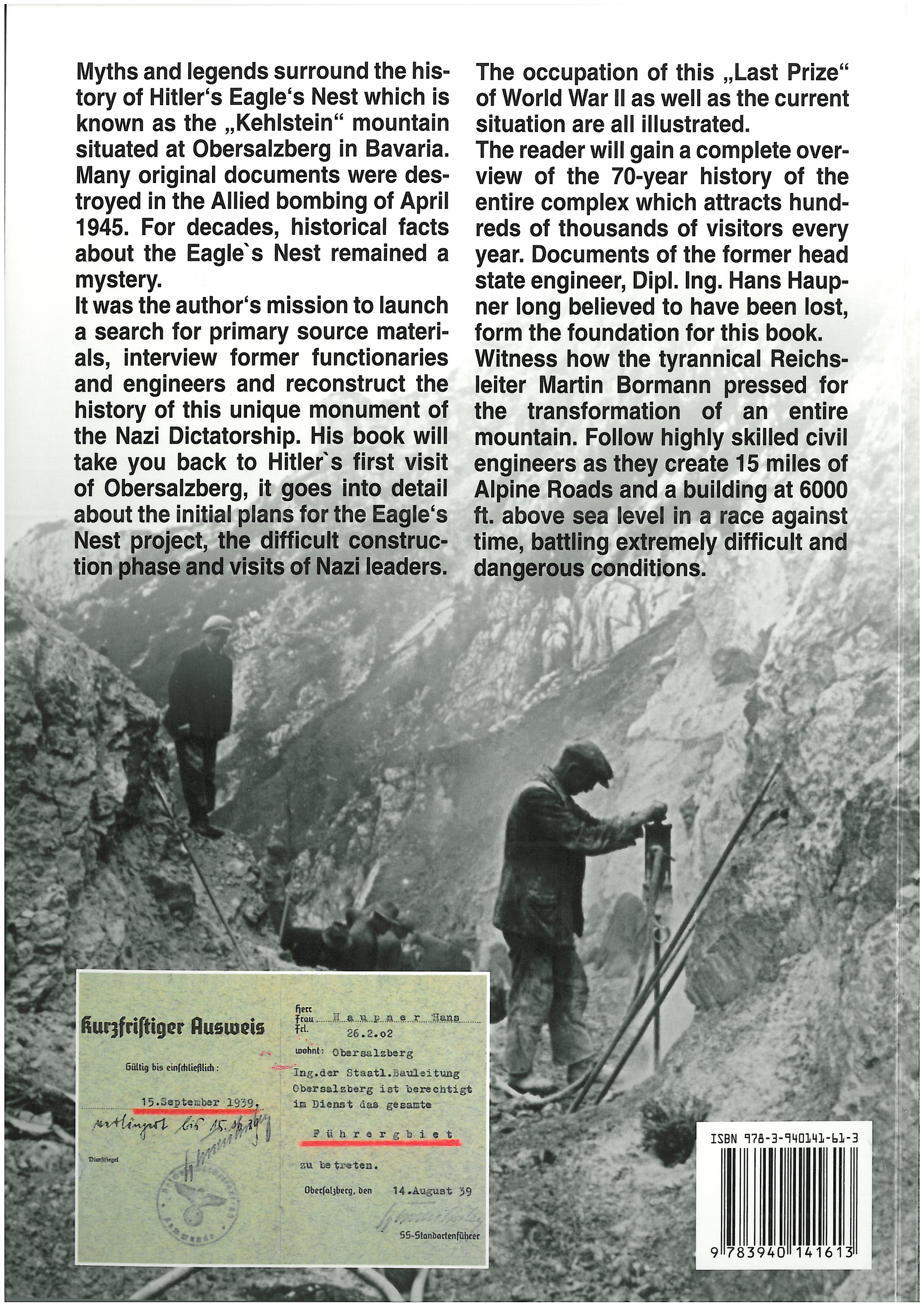 The reader will gain a complete overview of the 70-year history of the entire complex which attracts hundreds of thousands of visitors every year. Documents of the former head state engineer, Dipl. Ing. Hans Haupner long believed to have been lost, form the foundation for this book. Witness how the tyrannical Reichsleiter Martin Barmann pressed for the transformation of an entire mountain. Follow highly skilled civil engineers as they create 15 miles of Alpine Roads and a building at 6000 ft. above sea level in a race against time, battling extremely difficult and dangerous conditions.