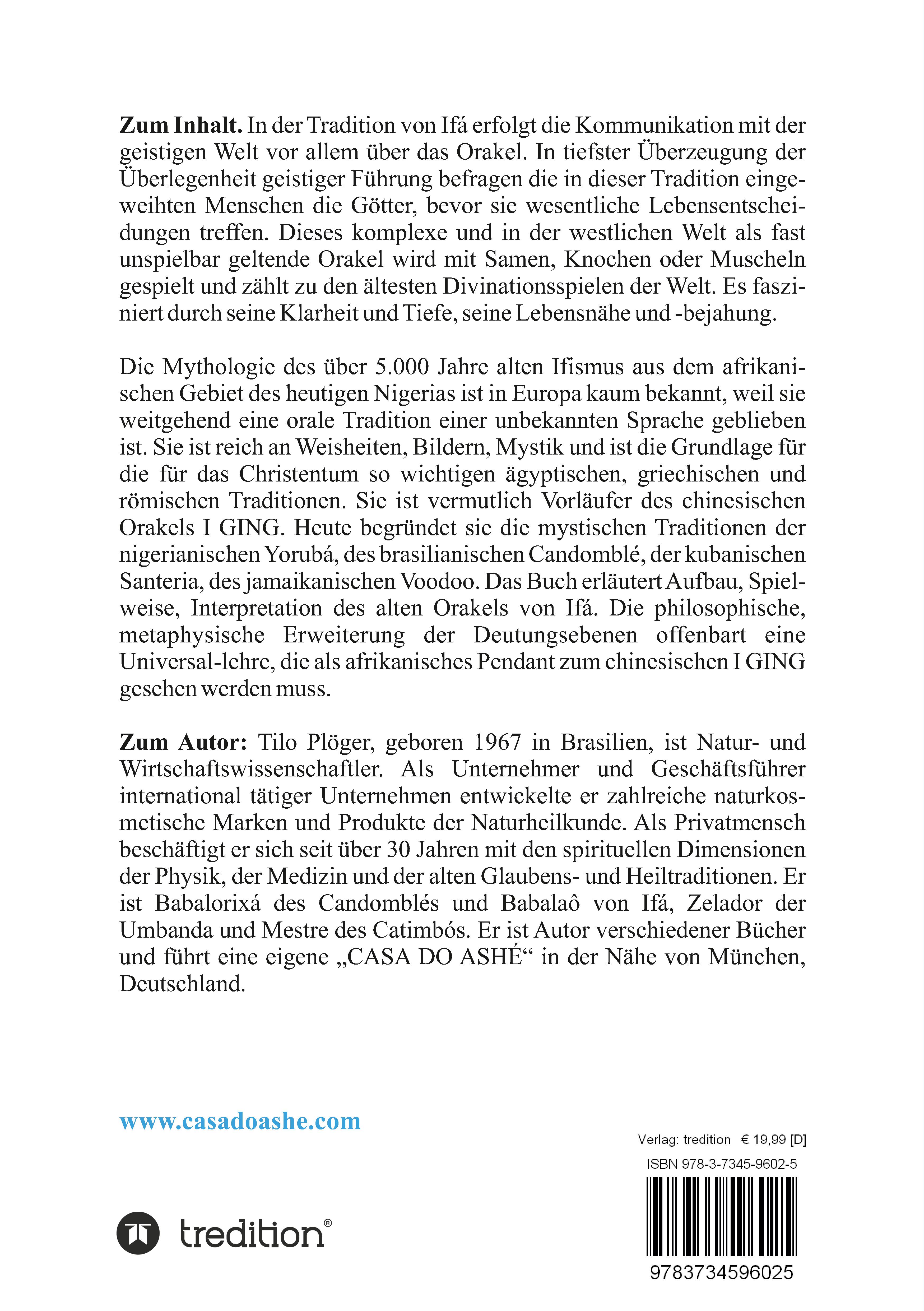 Zum Inhalt. In der Tradition von Ifá erfolgt die Kommunikation mit der geistigen Welt vor allem über das Orakel. In tiefster Überzeugung der Überlegenheit geistiger Führung befragen die in dieser Tradition eingeweihten Menschen die Götter, bevor sie wesentliche Lebensentscheidungen treffen. Dieses komplexe und in der westlichen Welt als fast unspielbar geltende Orakel wird mit Samen, Knochen oder Muscheln gespielt und zählt zu den ältesten Divinationsspielen der Welt. Es fasziniert durch seine Klarheit und Tiefe, seine Lebensnähe und -bejahung. Die Mythologie des über 5.000 Jahre alten Ifismus aus dem afrikanischen Gebiet des heutigen Nigerias ist in Europa kaum bekannt, weil sie weitgehend eine orale Tradition einer unbekannten Sprache geblieben ist. Sie ist reich an Weisheiten, Bildern, Mystik und ist die Grundlage für die für das Christentum so wichtigen ägyptischen, griechischen und römischen Traditionen. Sie ist vermutlich Vorläufer der chinesischen Orakels I GING. Heute begründet sie die mystischen Traditionen der nigerianischen Yorubá, des brasilianischen Candomblé, der kubanischen Santeria, des jamaikanischen Voodoo. Das Buch erläutert Aufbau, Spielweise, Interpretation des alten Orakels von Ifá. Die philosophische, metaphysische Erweiterung der Deutungsebenen offenbart eine Universallehre, die als afrikanisches Pendant zum chinesischen I GING gesehen werden muss.