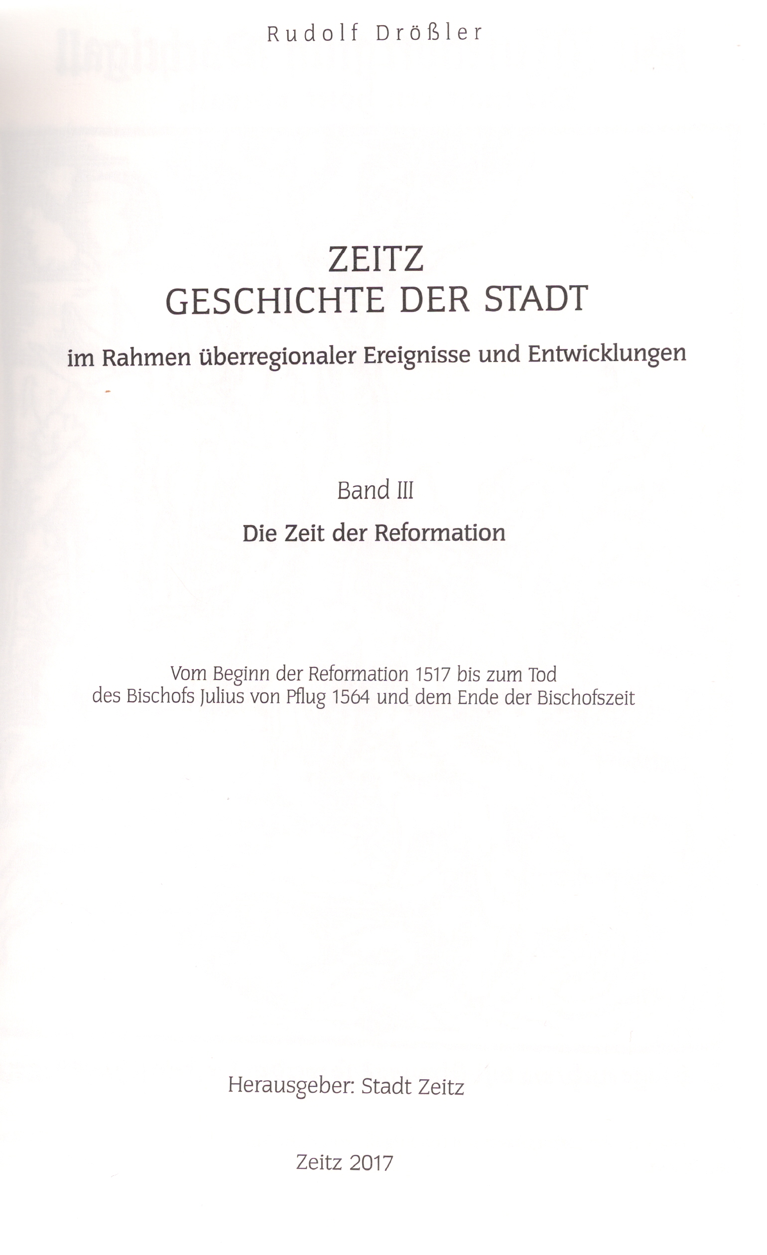 Dieser Zeitraum umfasst mehr als die Hälfte der bisher bekannten Zeitzer Geschichte. Wegen der Bedeutung der Reformation auch für unsere Stadt und deren Bewohner stellen wir die Zeit von 1517 bis 1564 als Band III unserer Stadtgeschichte gesondert da.