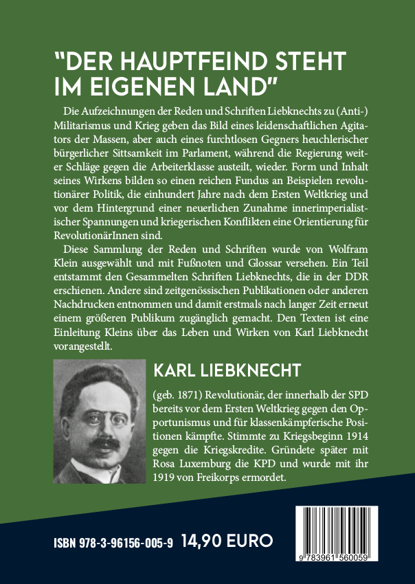 Die Aufzeichnungen der Reden und Schriften Liebknechts zu (Anti-) Militarismus und Krieg geben das Bild eines leidenschaftlichen Agitators der Massen, aber auch eines furchtlosen Gegners heuchlerischer bürgerlicher Sittsamkeit im Parlament, während die Regierung weiter Schläge gegen die Arbeiterklasse austeilt, wieder. Form und Inhalt seines Wirkens bilden so einen reichen Fundus an Beispielen revolutionärer Politik, die einhundert Jahre nach dem Ersten Weltkrieg und vor dem Hintergrund einer neuerlichen Zunahme innerimperialistischer Spannungen und kriegerischen Konflikten eine Orientierung für RevolutionärInnen sind.Diese Sammlung der Reden und Schriften wurde von Wolfram Klein ausgewählt und mit Fußnoten und Glossar versehen. Ein Teil entstammt den Gesammelten Schriften Liebknechts, die in der DDR erschienen. Andere sind zeitgenössischen Publikationen oder anderen Nachdrucken entnommen und damit erstmals nach langer Zeit erneut einem größeren Publikum zugänglich gemacht. Den Texten ist eine Einleitung Kleins über das Leben und Wirken von Karl Liebknecht vorangestellt.