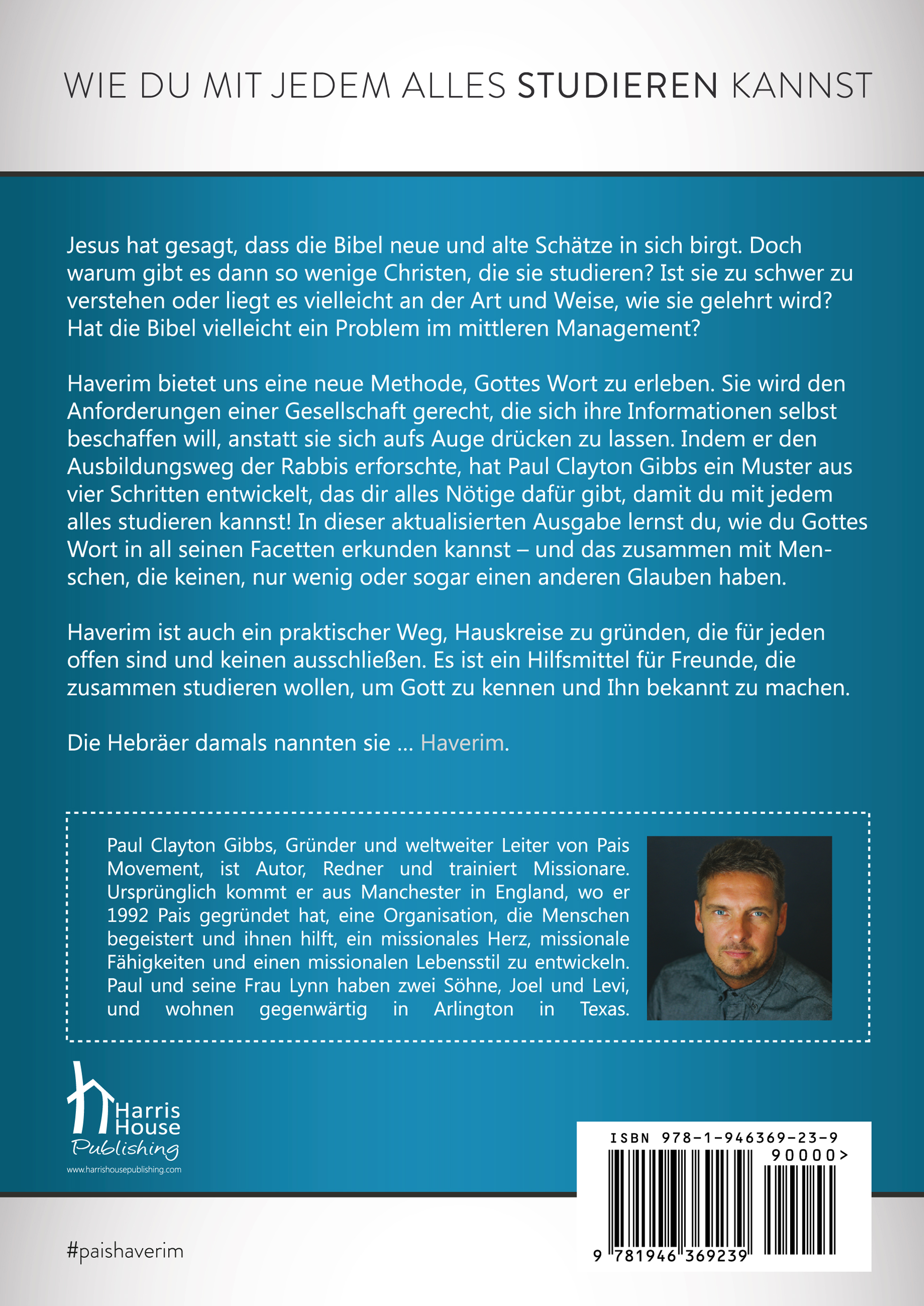 Haverim bietet uns eine neue Methode, Gottes Wort zu erleben. Sie wird den Anforderungen einer Gesellschaft gerecht, die sich ihre Informationen selbst beschaffen will, anstatt sie sich aufs Auge drücken zu lassen. Indem er den Ausbildungsweg der Rabbis erforschte, hat Paul Clayton Gibbs ein Muster aus vier Schritten entwickelt, das dir alles Nötige dafür gibt, damit du mit jedem alles studieren kannst! In dieser aktualisierten Ausgabe lernst du, wie du Gottes Wort in all seinen Facetten erkunden kannst - und das zusammen mit Menschen, die keinen, nur wenig oder sogar einen anderen Glauben haben.