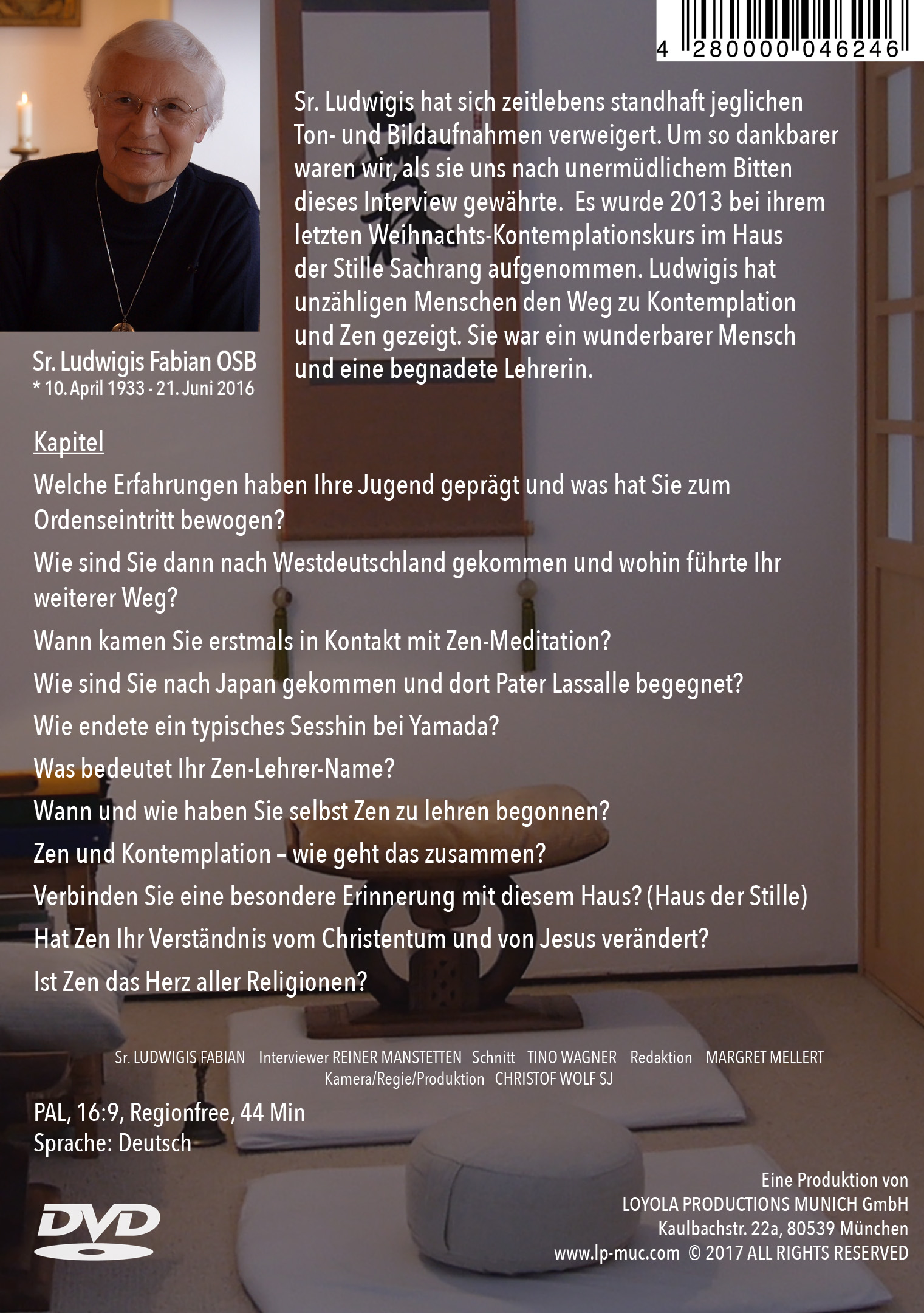 Sr. Ludwigis hat sich zeitlebens standhaft jeglichen Ton- und Bildaufnahmen verweigert. Um so dankbarer waren wir, als sie uns nach unermüdlichem Bitten dieses Interview gewährte. Es wurde 2013 bei ihrem letzten Weihnachts-Kontemplationskurs im Haus der Stille Sachrang aufgenommen. Ludwigis hat unzähligen Menschen den Weg zu Kontemplation und Zen gezeigt. Sie war ein wunderbarer Mensch und eine begnadete Lehrerin.