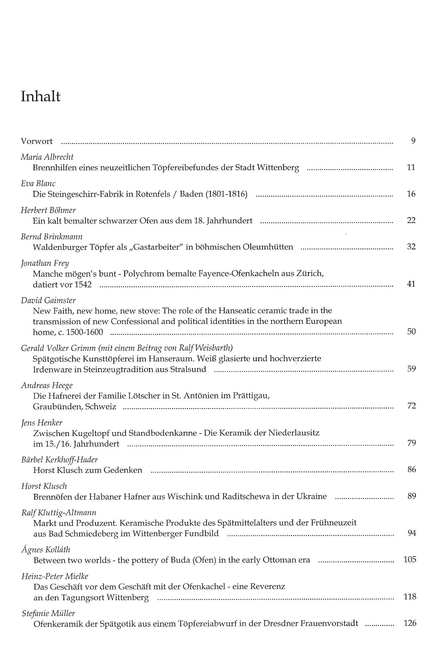 den renovierten historischen Räumen der Leucorea (ehemalige Kollegiengebäude) im Herzen der Altstadt. Das Rahmenthema "Keramik und Töpferei im 15./16. Jahrhundert" war ganz bewusst flankierend zu unseren Forschungsarbeiten im Vorfeld des 500-jährigen Reformationsjubiläums (Lutherjahr 2017) gewählt worden. Das Fluidum der überschaubaren und doch in seiner weitgehend noch baulich nachvollziehbaren Geschlossenheit höchst eindrucksvollen Stadt zeugt von der großen wirtschaftlichen und kulturellen Blüte in eben jener Zeit, im Grundriss sogar noch von der hochmittelalterlichen Landeserschließung der Askanier im Raum östlich der EIbe. An der Herrschaft in Wittenberg hing die auf Reichsebene und darüber hinaus im alten Europa hohes politisches Ansehen garantierende Würde der sächsischen Kurfürsten. Letztere gründeten dort 1502 eine der für lange Zeit wichtigsten deutschen Universitäten (die Leucorea), die seit 1817 mit der Universität Halle verschmolzen wurde. Im fortdauernden historischen Fluidum dominiert heute der Nachhall der protestantischen Reformation mit ihren Protagonisten Martin Luther, Philipp Melanchthon und dem evangelischen Predigerseminar. Das Spektrum der 38 fast durchweg hier abgedruckten Vorträge war räumlich und zeitlich weit gestreut vom hohen Mittelalter bis zur Moderne, von der Schweiz und Österreich, über Tschechien, Ungarn, Rumänien, die Ukraine, den Ostseeraum bis in die Niederlande und das Rheinland.