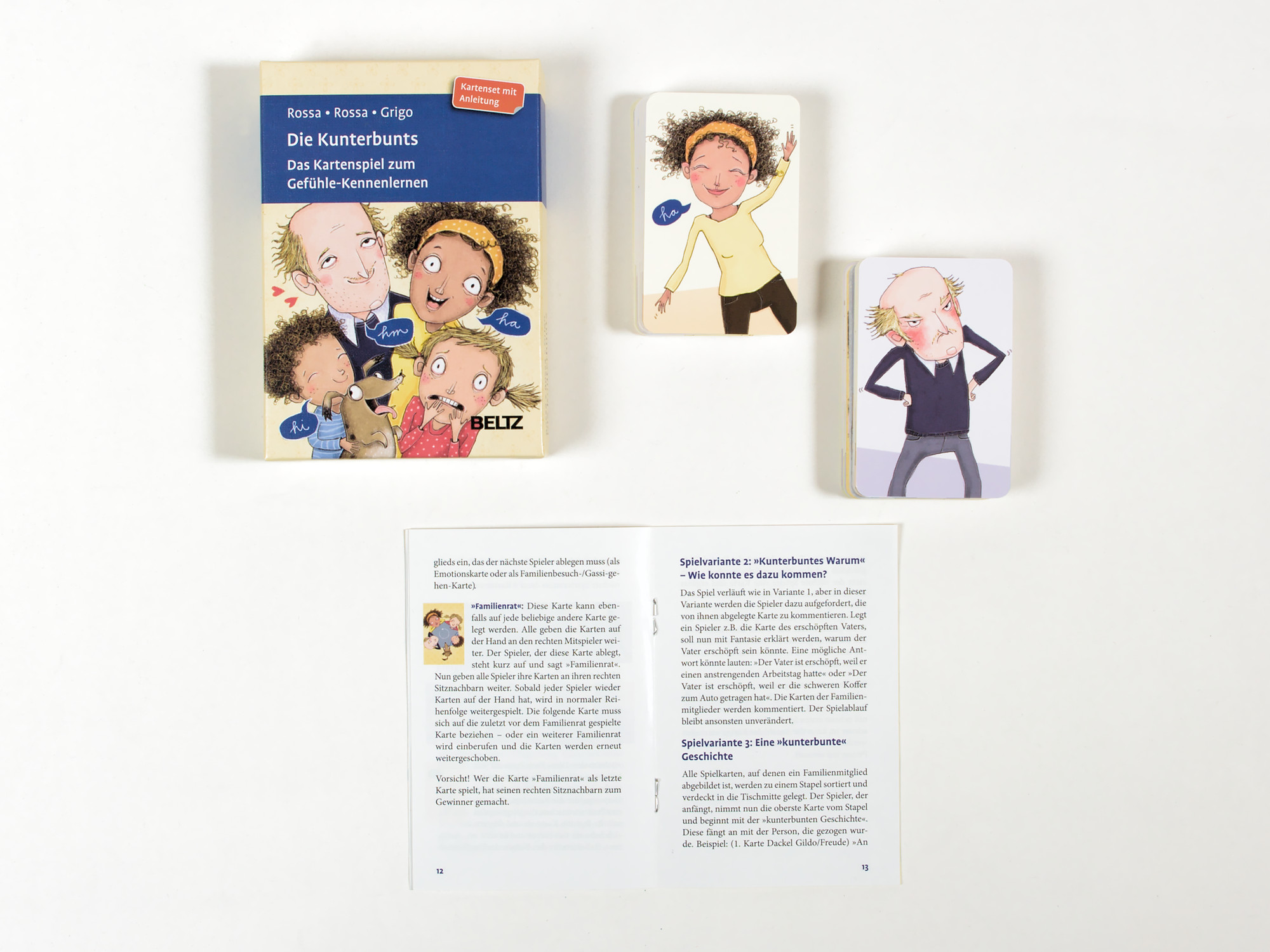 »Gassi gehen« – Du setzt einmal aus. »Familienbesuch« – Du ziehst vier Karten. Hast du einen ärgerlichen Hund auf der Hand? Oder nur fröhliche Kinder? In der Psychotherapiestunde mit Kindern wird viel gespielt und »Die Kunterbunts« ist ein für diesen Zweck entwickeltes, unkompliziertes Spiel nach Uno-Regeln. Durch das bekannte Spielprinzip bedarf es keiner langen Einführung: Die fröhliche Mutter darf auf die ärgerliche Mutter oder auf die fröhliche Tochter gelegt werden etc. Neben dem Spaß werden Empathie sowie die Wechselwirkungen von Emotionen in Familien vermittelt. Für alle, die mit Kindern therapeutisch oder beraterisch arbeiten
