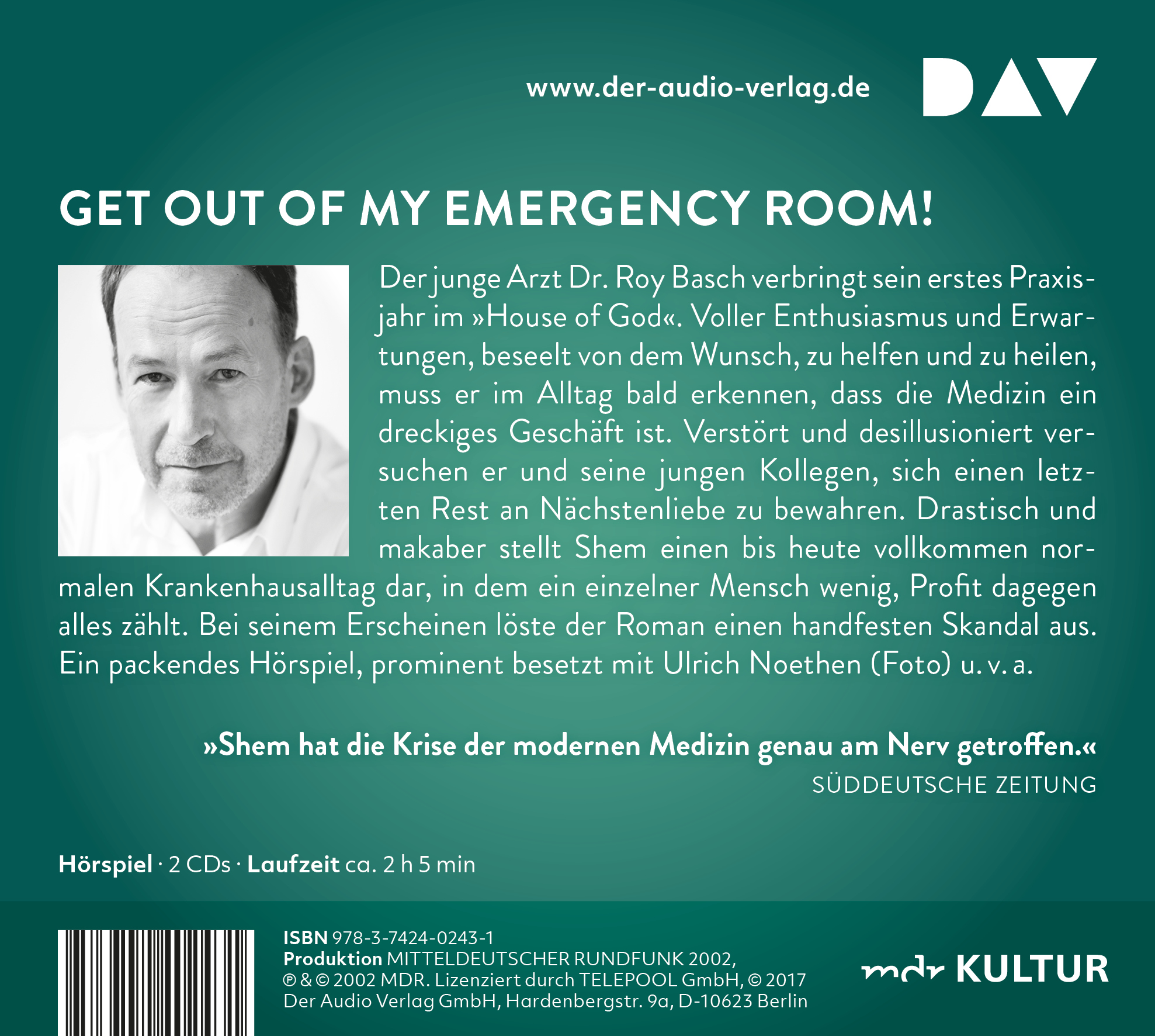 | Schlagworte | 20. Jahrhundert (1900 bis 1999 n. Chr.) • Arztroman • Ethik und Moralphilosophie • Gomer • Halbgott in weiß • Halbgott in weiß • Hörbuch; Hörspiel • Hörbuch; Hörspiel • Krankenhaus • Medizin • Medizin, allgemein • Medizinethik • Medizinstudium • Menschenwürde • Menschenwürde • Moderne und zeitgenössische Belletristik • Patientenverfügung • Patientenverfügung • Vereinigte Staaten von Amerika, USA |