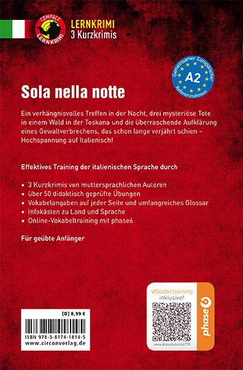 Sie lernen gerade Italienisch und möchten Ihre Sprachkenntnisse verbessern oder vorhandenes Wissen auffrischen? Sie wollen lernen und dabei unterhalten werden? Sie lieben spannende Geschichten und wollen authentische Texte auf Italienisch lesen? Dann sind unsere Compact Lernkrimi Kurzkrimis genau das Richtige für Sie. In "Sola nella notte" erwarten Sie drei spannende Kriminalfälle, die von muttersprachlichen Autorinnen speziell für das Niveau A2 geschrieben wurden. Mit dem einzigartigen Compact Lernkonzept des Circon Verlags erwerben Sie spielerisch Sprachkompetenzen. Gehen Sie mit unseren Ermittlern auf Verbrecherjagd und verbessern Sie ganz nebenbei Ihren Italienisch-Wortschatz, vertiefen Sie Ihre Grammatikkenntnisse und erfahren Sie Wissenswertes über Land und Leute. Speziell konzipierte, thematische Übungen werden in die spannenden Kriminalfälle eingebunden und erhöhen den Lerneffekt. So geht Sprachenlernen ganz nebenbei!