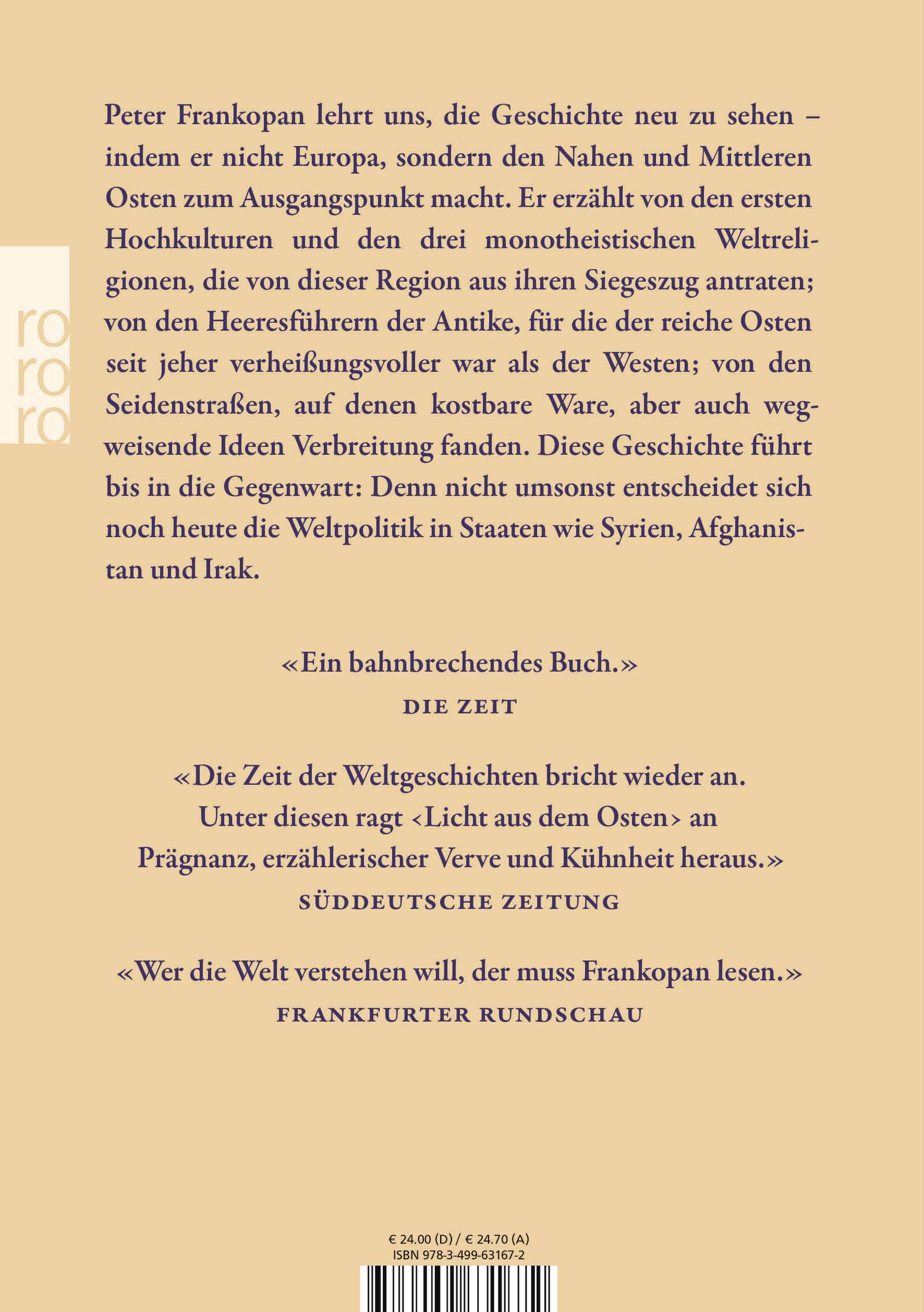 Peter Frankopan schlägt einen weiten Bogen, und das nicht nur zeitlich: Er rückt zwei Welten zusammen, Orient und Okzident, die historisch viel enger miteinander verbunden sind, als wir glauben. Ein so fundiertes wie packend erzähltes Geschichtswerk, das wahrhaft die Augen öffnet.