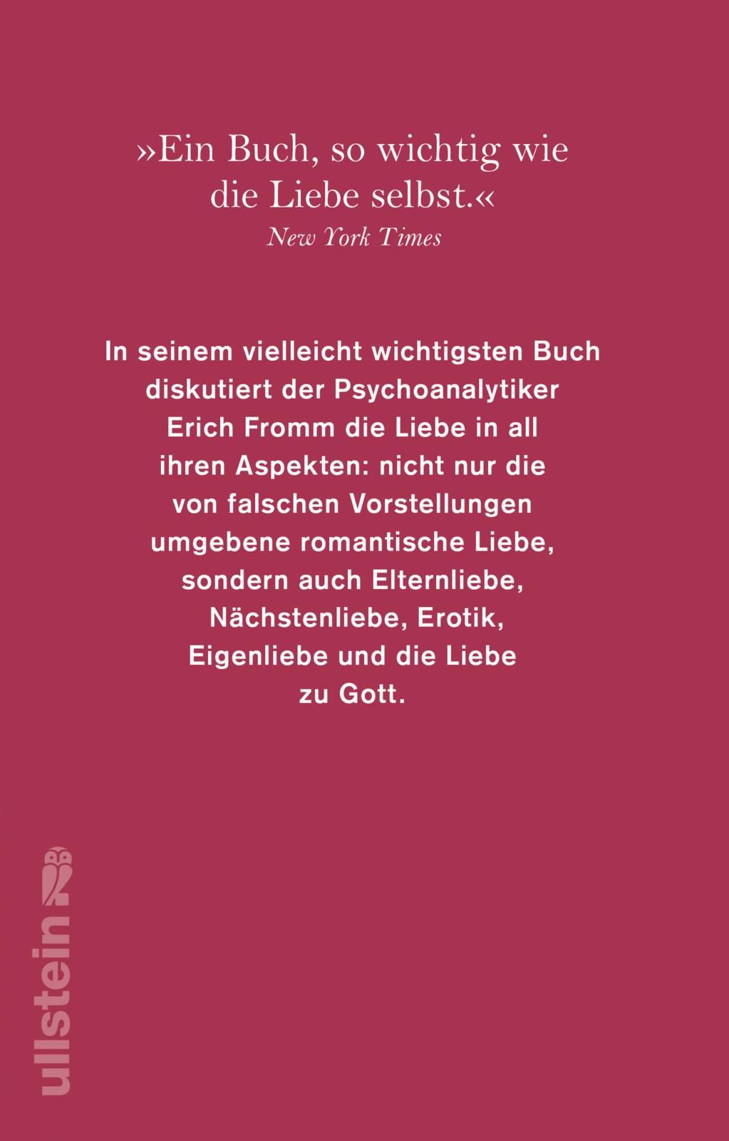 In seinem vielleicht wichtigsten Buch diskutiert der Psychoanalytiker Erich Fromm die Liebe in alle ihren Aspekten: nicht nur die von falschen Vorstellungen umgebene romantische Liebe, sondern auch Elternliebe, Nächstenliebe, Erotik, Eigenliebe und die Liebe zu Gott.