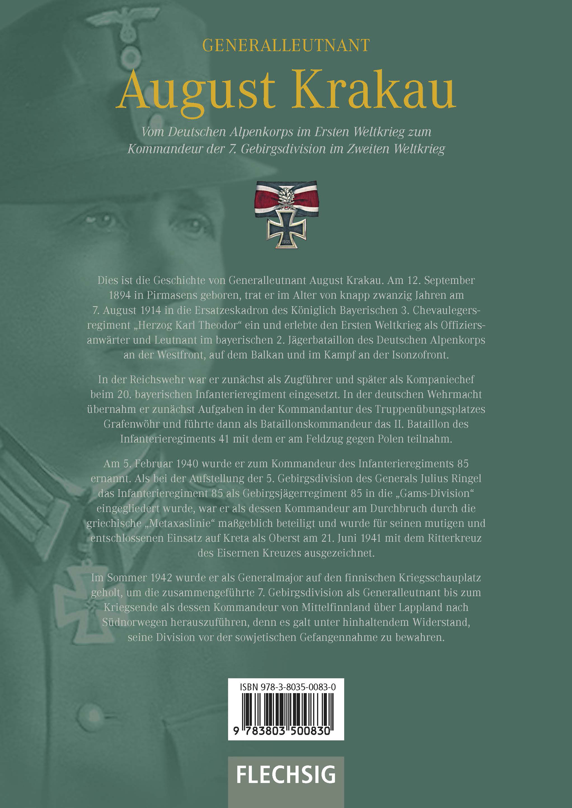 Dies ist die Geschichte von Generalleutnant August Krakau. Am 12. September 1894 in Pirmasens geboren, trat er im Alter von knapp zwanzig Jahren am 7. August 1914 in die Ersatzeskadron des Königlich Bayerischen 3. Chevaulegersregiment "Herzog Karl Theodor" ein und erlebte den Ersten Weltkrieg als Offiziersanwärter und Leutnant im bayerischen 2. Jägerbataillon des Deutschen Alpenkorps an der Westfront, auf dem Balkan und im Kampf an der Isonzofront. In der Reichswehr war er zunächst als Zugführer und später als Kompaniechef beim 20. bayerischen Infanterieregiment eingesetzt. In der deutschen Wehrmacht übernahm er zunächst Aufgaben in der Kommandantur des Truppenübungsplatzes Grafenwöhr und führte dann als Bataillonskommandeur das II. Bataillon des Infanterieregiments 41 mit dem er am Feldzug gegen Polen teilnahm. Am 5. Februar 1940 wurde er zum Kommandeur des Infanterieregiments 85 ernannt. Als bei der Aufstellung der 5. Gebirgsdivision des Generals Julius Ringel das Infanterieregiment 85 als Gebirgsjägerregiment 85 in die "Gams-Division" eingegliedert wurde, war er als dessen Kommandeur am Durchbruch durch die griechische "Metaxaslinie" maßgeblich beteiligt und wurde für seinen mutigen und entschlossenen Einsatz auf Kreta als Oberst am 21. Juni 1941 mit dem Ritterkreuz des Eisernen Kreuzes ausgezeichnet.Im Sommer 1942 wurde er als Generalmajor auf den finnischen Kriegsschauplatz geholt, um die zusammengeführte 7. Gebirgsdivision als Generalleutnant bis zum Kriegsende als dessen Kommandeur von Mittelfinnland über Lappland nach Südnorwegen herauszuführen, denn es galt unter hinhaltendem Widerstand, seine Division vor der sowjetischen Gefangennahme zu bewahren.
